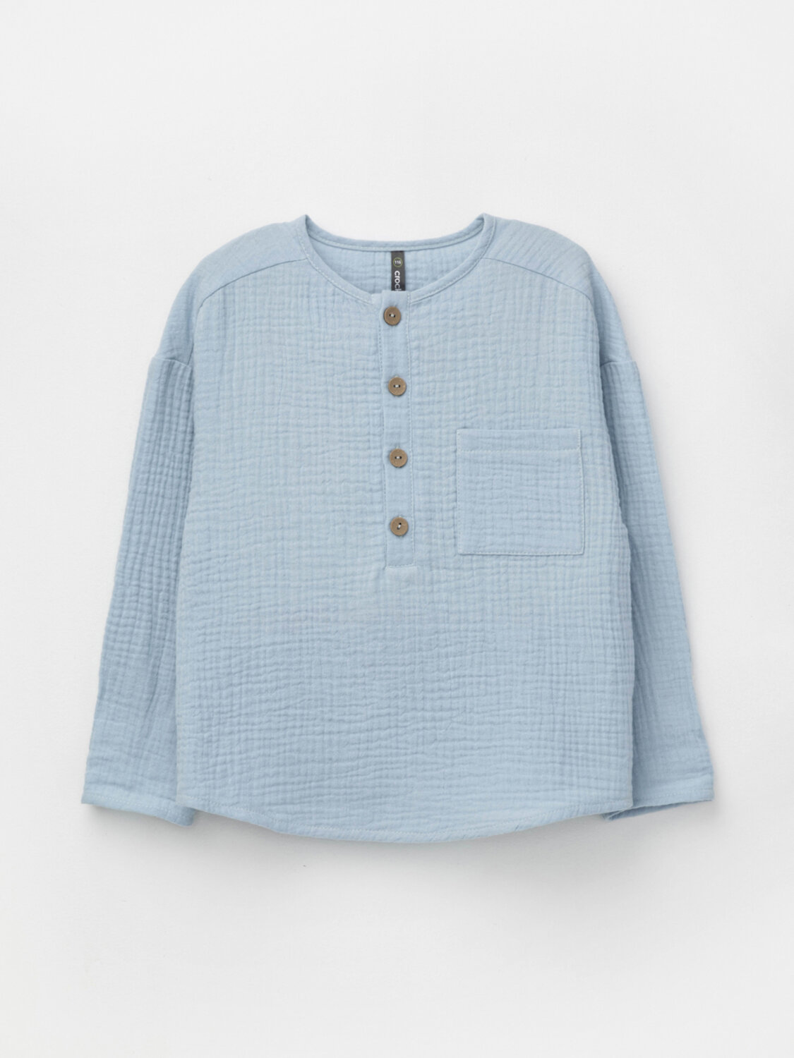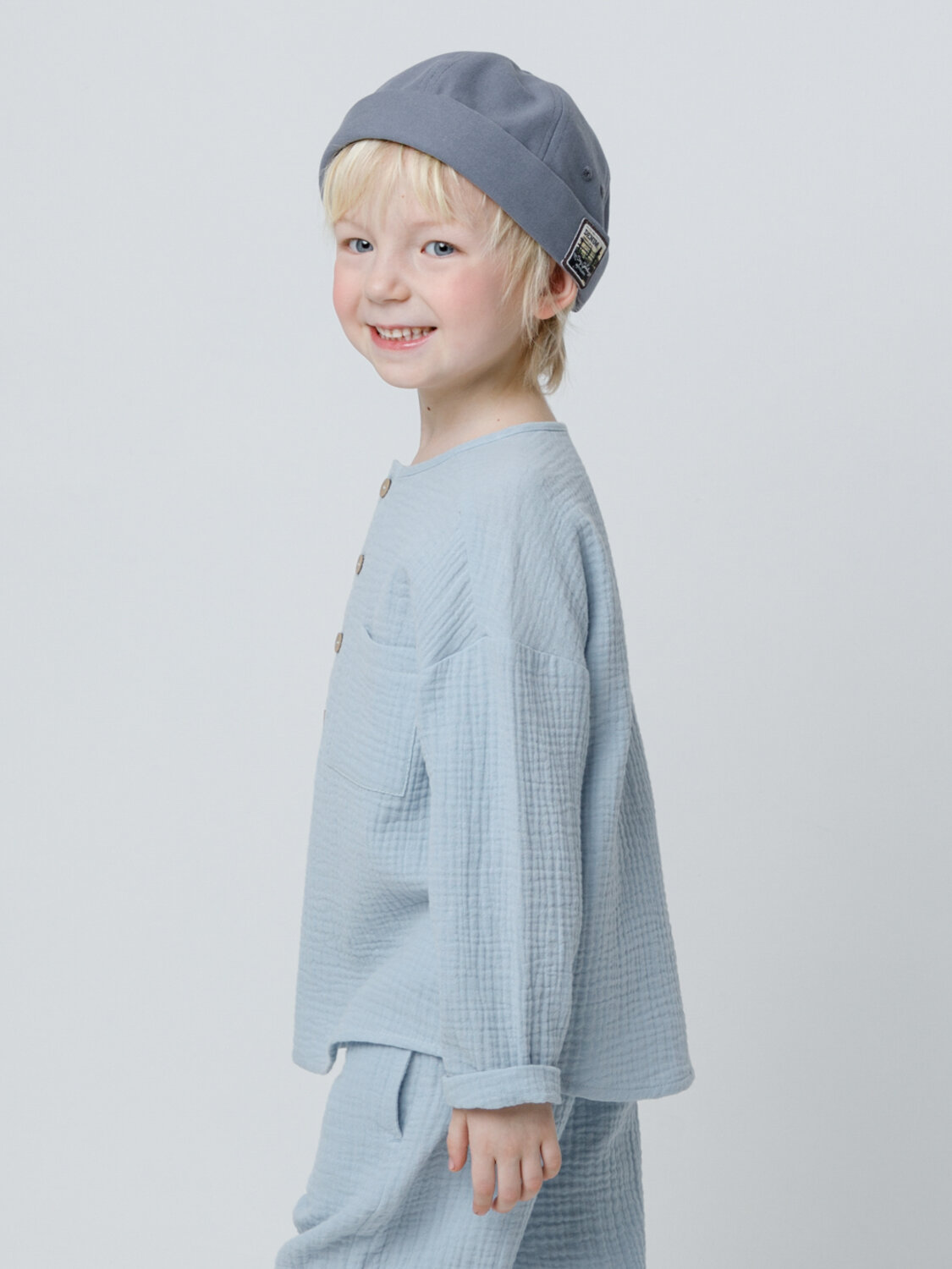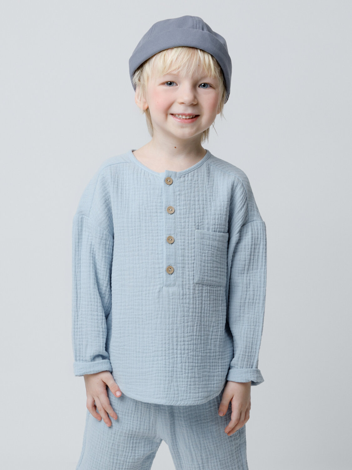 Легкая детская рубашка свободного кроя из мягкого хлопокового муслина, слегка спущенной линией плеча, длинными рукавами и с застежкой на пуговицы. Изделие сохраняет цвет, форму и фактуру жатости после многократных стирок.