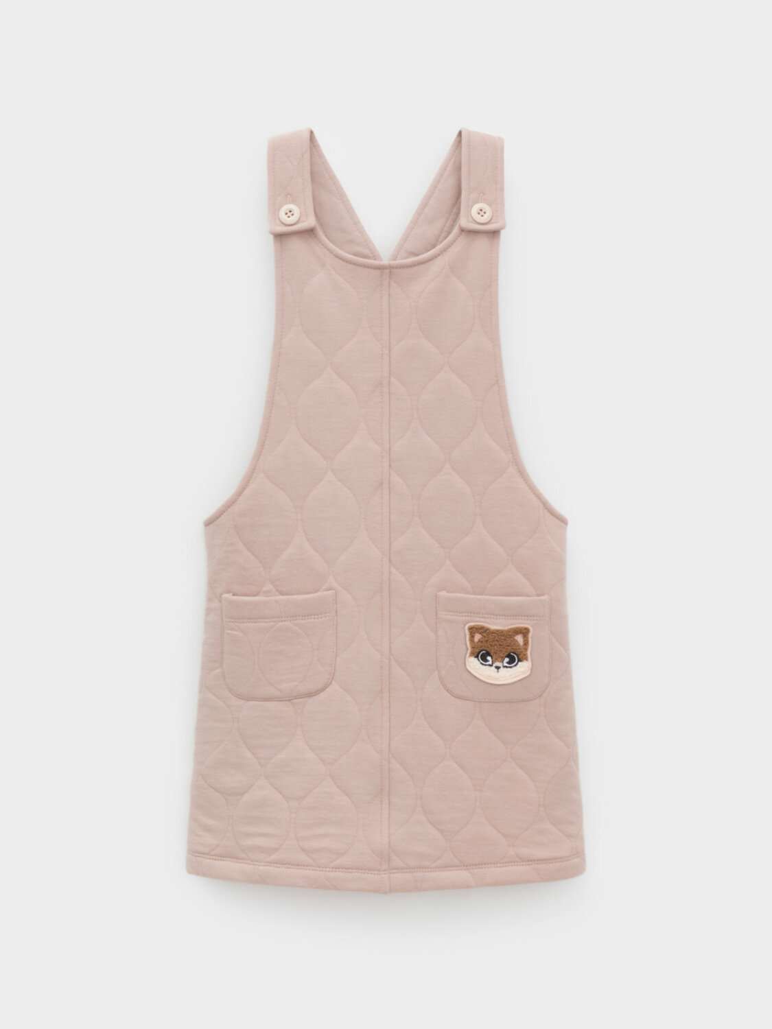 Сарафан на лямках из капитония с двумя накладными карманами. Капитоний – это стёганое трикотажное полотно с утеплителем из полиэстеровой нити. Лямки застегиваются на пуговицы. Все трикотажные полотна производятся в соответствии с нормами швейцарского сертификата ЭкоТекс.