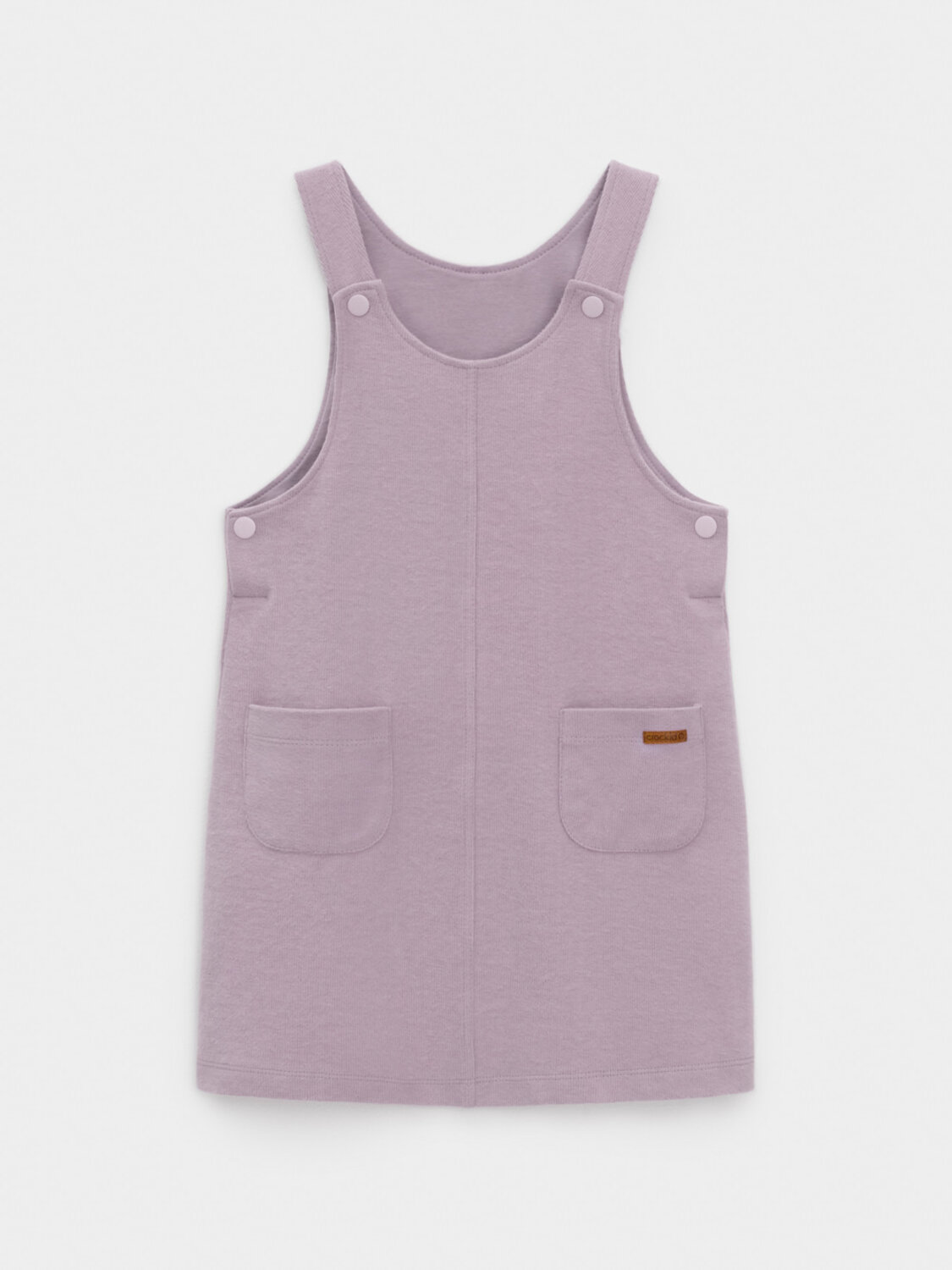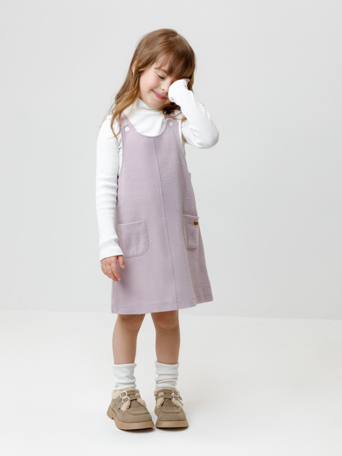 Сарафан на лямках из мягкого трикотажа селаник с peach эффектом. Peach эффект достигается с помощью технологии обработки полотна, при которой на его поверхности создаётся лёгкий ворс, напоминающий нежную текстуру кожи персика. Модель с двумя накладными карманами. Лямки застегиваются на кнопки. Все трикотажные полотна производятся в соответствии с нормами швейцарского сертификата ЭкоТекс.