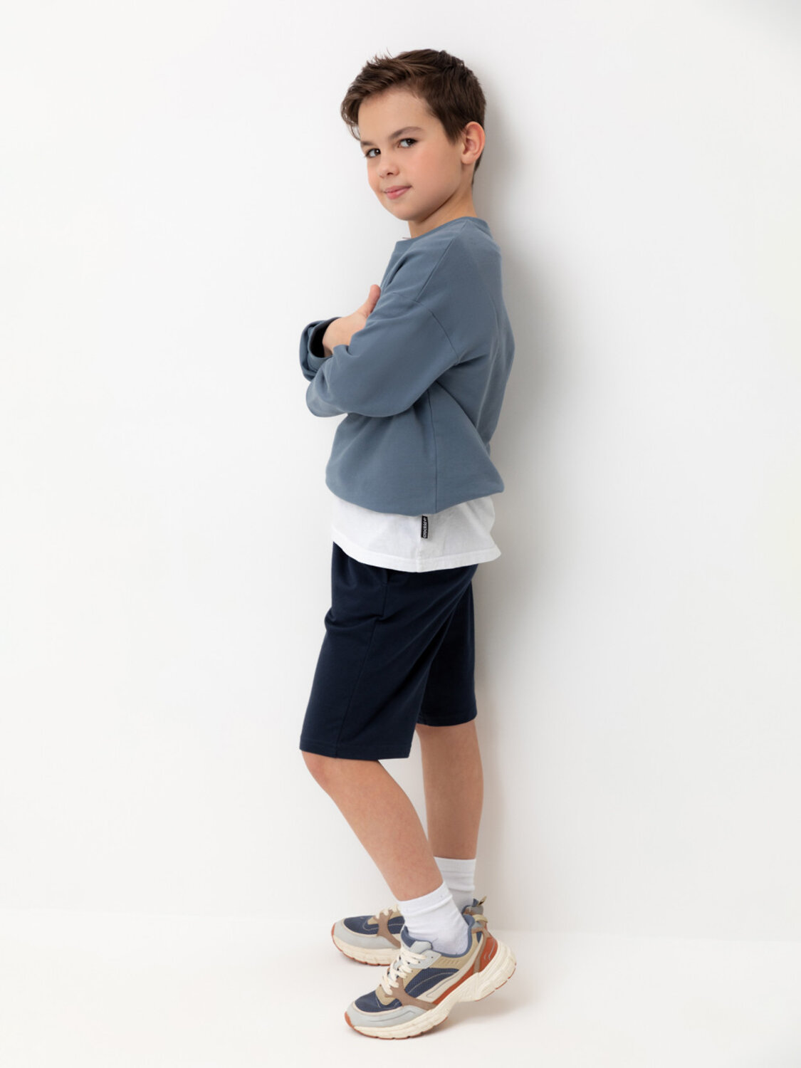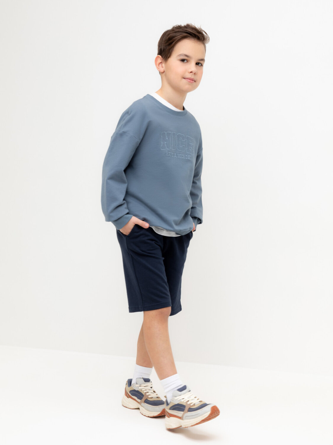 Трикотажные шорты для мальчика из петельчатого футера. Эластичный пояс на резинке регулируется по ширине с помощью шнурка, по бокам два удобных кармана.