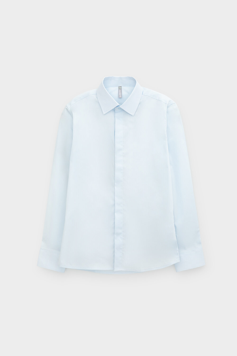 Классическая сорочка для мальчика с отложным воротником. Застегивается спереди на планку с потайными пуговицами. Длинные втачанные рукава с манжетами регулируются по ширине.