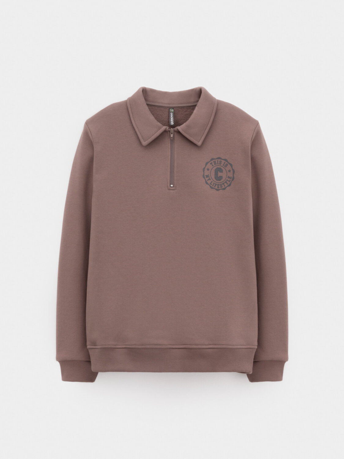 Свитшот с воротником для мальчика. Изготовлен из высококачественного петельчатого футера. В составе 80% натурального хлопка и 20% полиэстера, при этом полиэстер ввязан внутрь по особой технологии и не соприкасается с кожей. Манжеты и пояс выполнены из эластичного полотна. На груди короткая застёжка на молнию. Оригинальный принт выполнен из стойких текстильных гипоаллергенных красителей. Изделие сохраняет цвет и форму после многократных стирок.