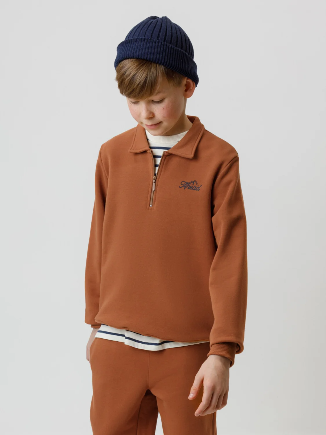 Свитшот с воротником для мальчика. Изготовлен из высококачественного петельчатого футера. В составе 80% натурального хлопка и 20% полиэстера, при этом полиэстер ввязан внутрь по особой технологии и не соприкасается с кожей. Манжеты и пояс выполнены из эластичного полотна. На груди короткая застёжка на молнию. Оригинальный принт выполнен из стойких текстильных гипоаллергенных красителей. Изделие сохраняет цвет и форму после многократных стирок.