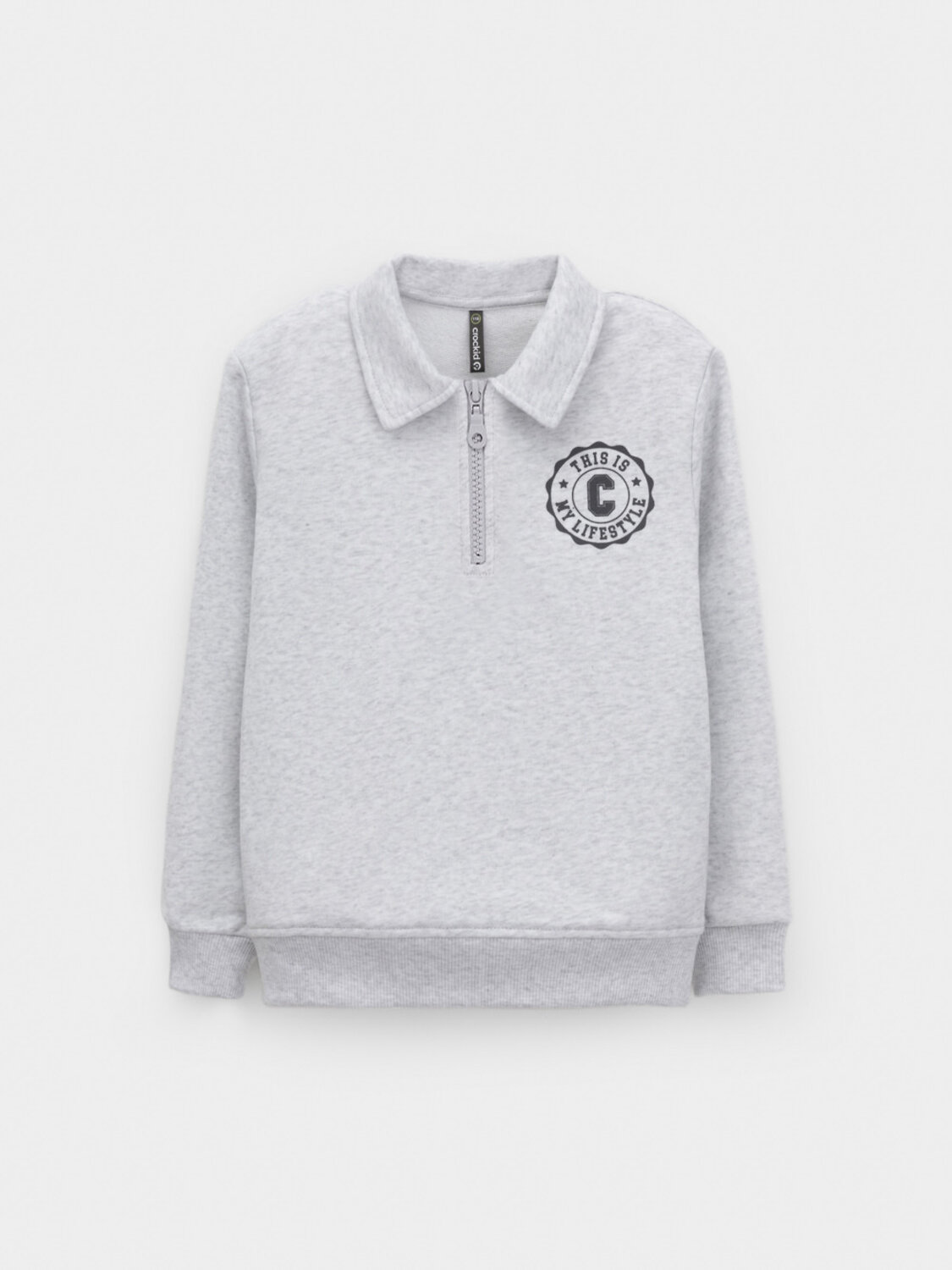 Свитшот с воротником для мальчика. Изготовлен из высококачественного петельчатого футера. В составе 80% натурального хлопка и 20% полиэстера, при этом полиэстер ввязан внутрь по особой технологии и не соприкасается с кожей. Манжеты и пояс выполнены из эластичного полотна. На груди короткая застёжка на молнию. Оригинальный принт выполнен из стойких текстильных гипоаллергенных красителей. Изделие сохраняет цвет и форму после многократных стирок.