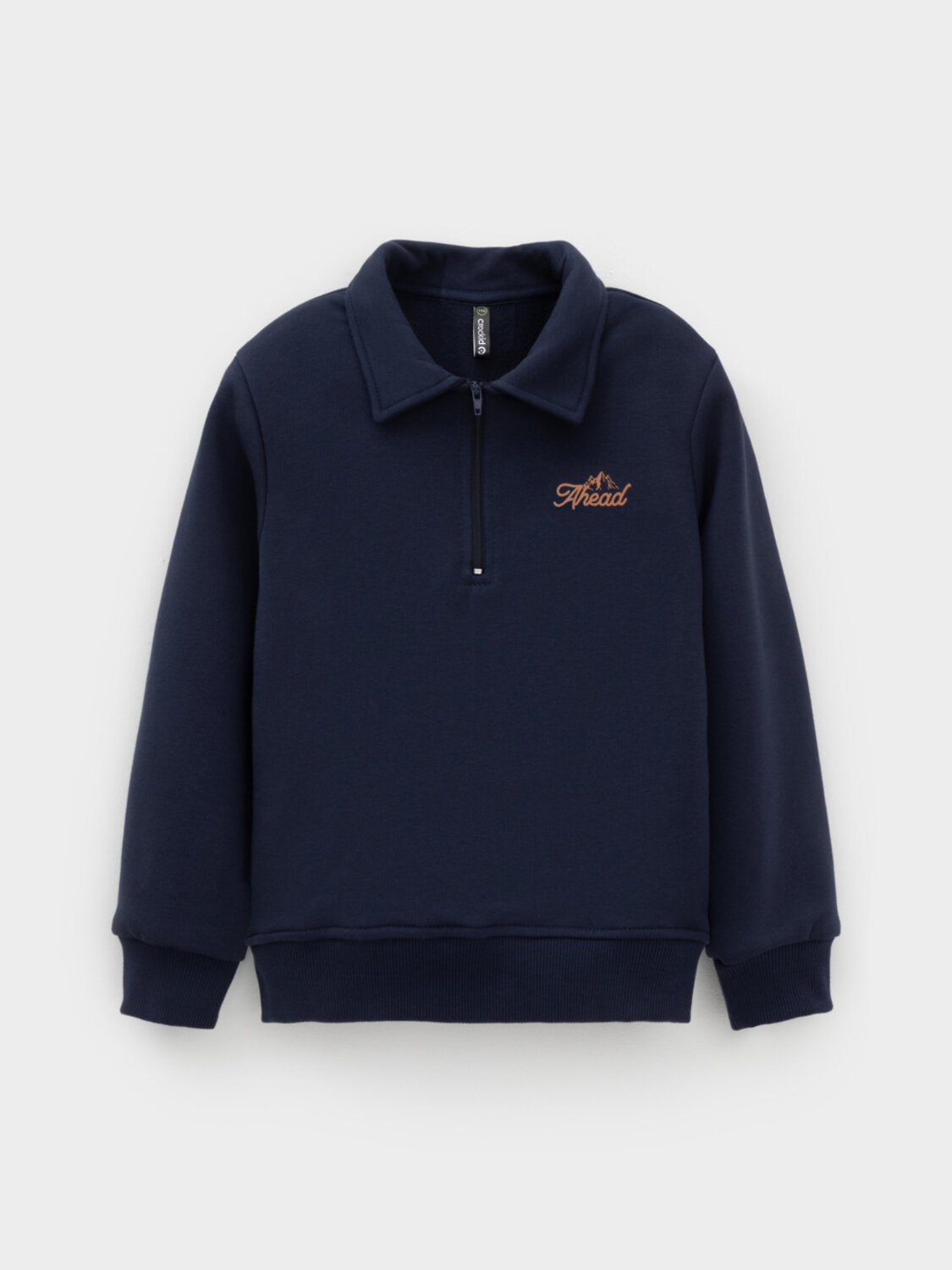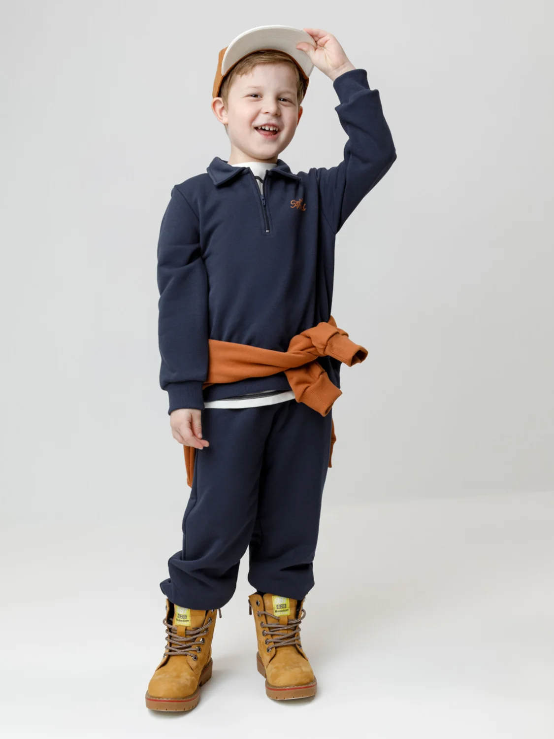 Свитшот с воротником для мальчика. Изготовлен из высококачественного петельчатого футера. В составе 80% натурального хлопка и 20% полиэстера, при этом полиэстер ввязан внутрь по особой технологии и не соприкасается с кожей. Манжеты и пояс выполнены из эластичного полотна. На груди короткая застёжка на молнию. Оригинальный принт выполнен из стойких текстильных гипоаллергенных красителей. Изделие сохраняет цвет и форму после многократных стирок.