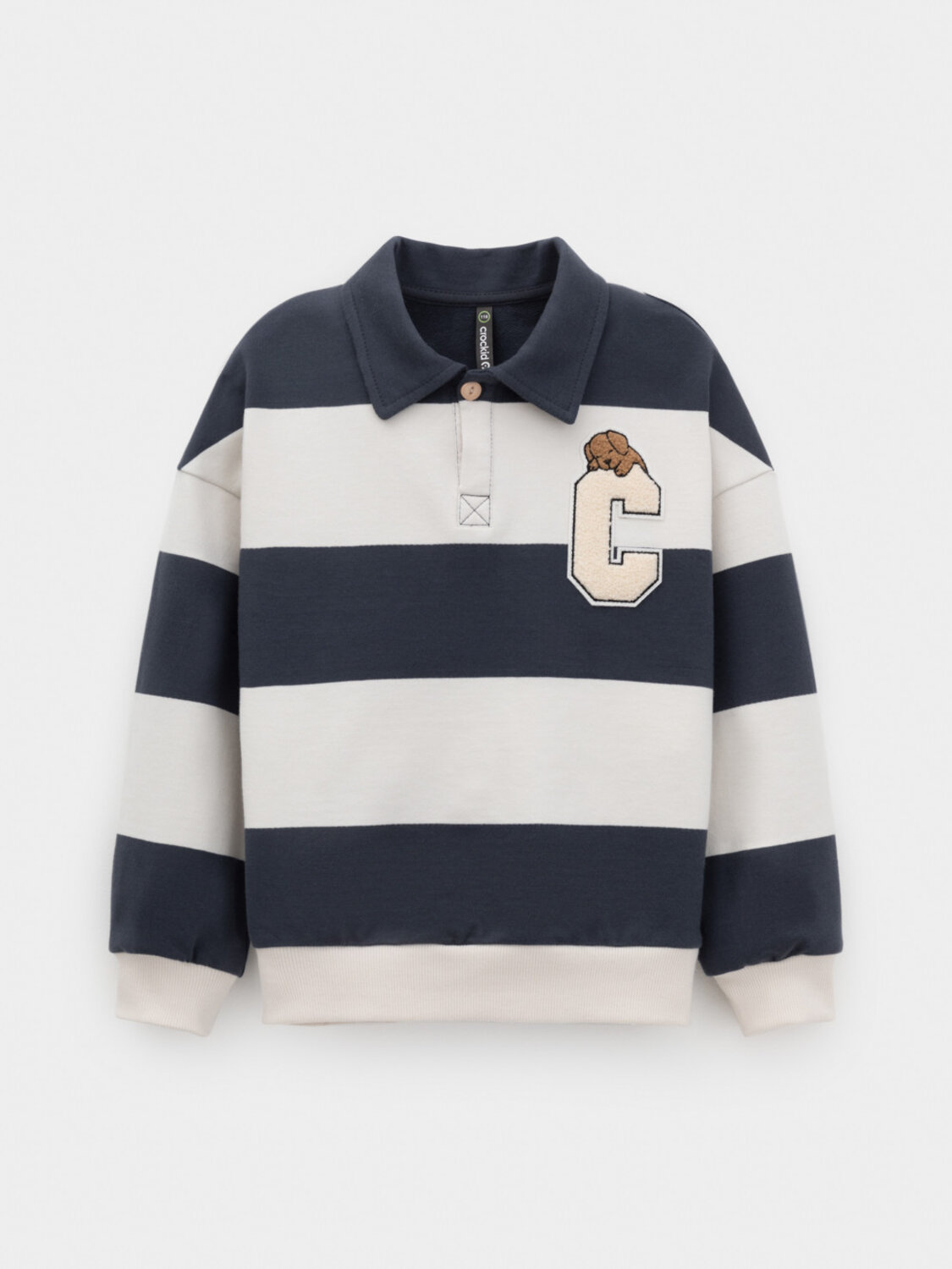 Свитшот с воротником для мальчика. Изготовлен из высококачественного петельчатого футера. Манжеты и пояс выполнены из эластичного полотна. На груди застёжка на пуговицу. Изделие сохраняет цвет и форму после многократных стирок.