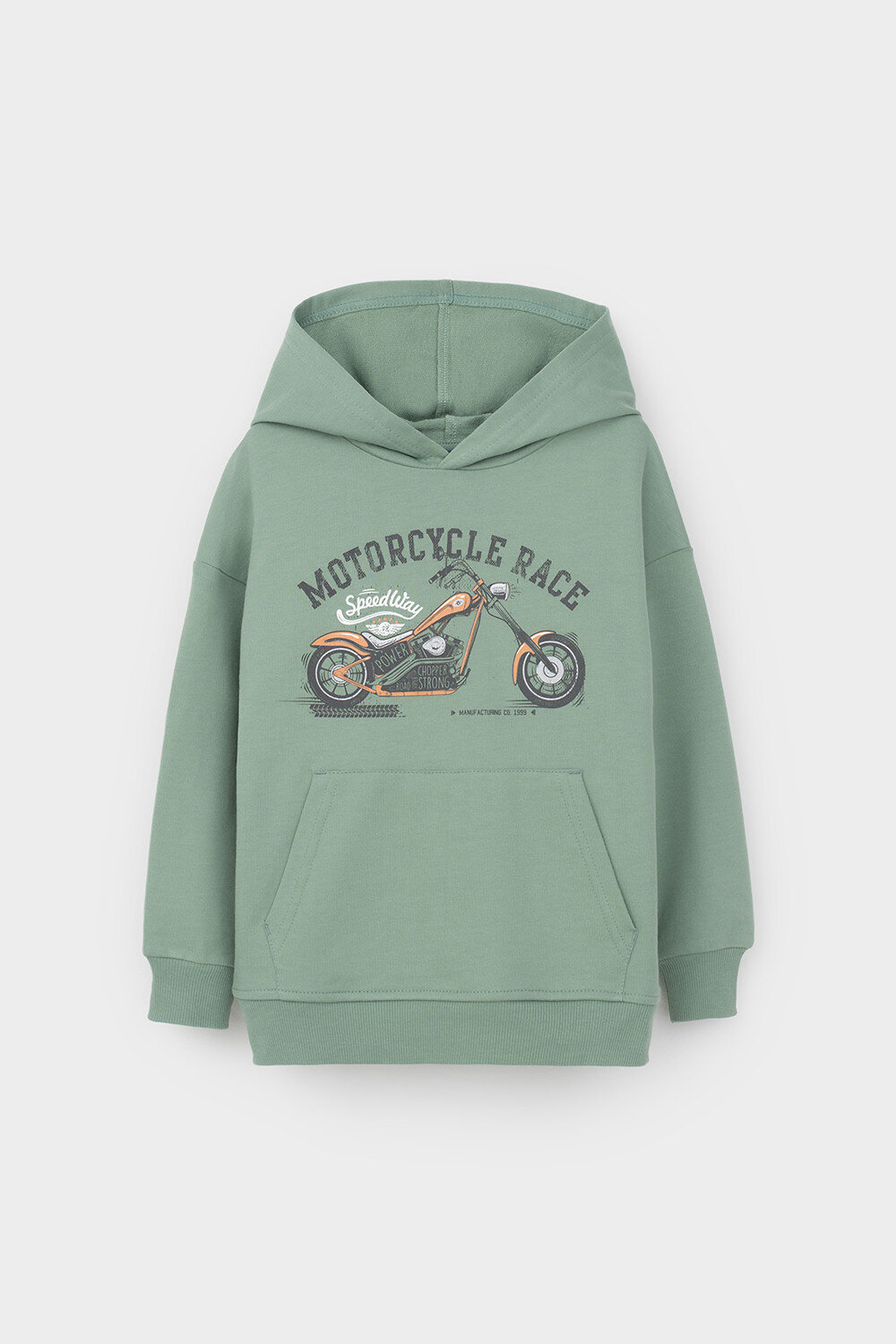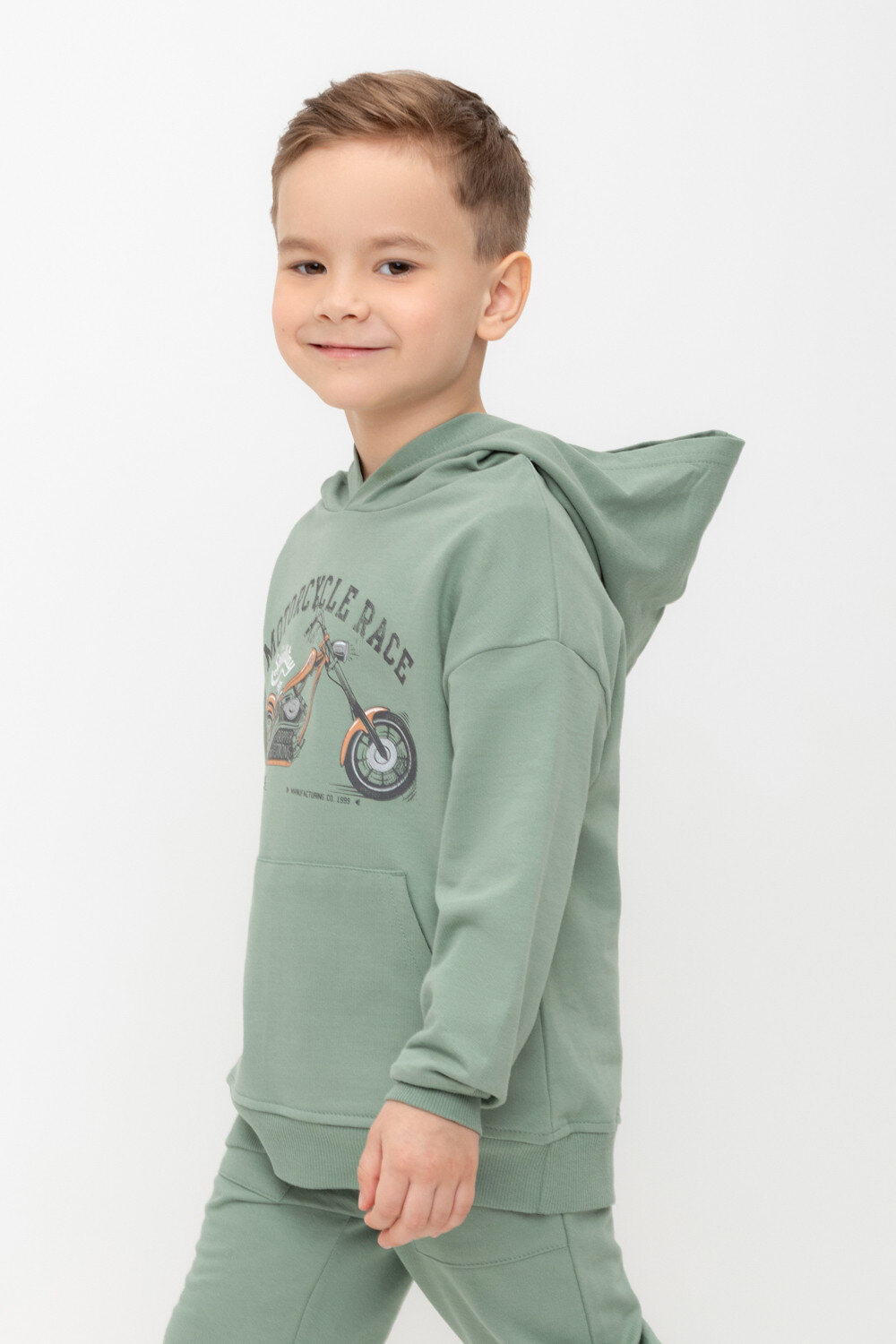 Толстовка с капюшоном для мальчика из петельчатого футера . Манжеты и пояс из эластичного трикотажа в рубчик. Спереди удобный карман-кенгуру.