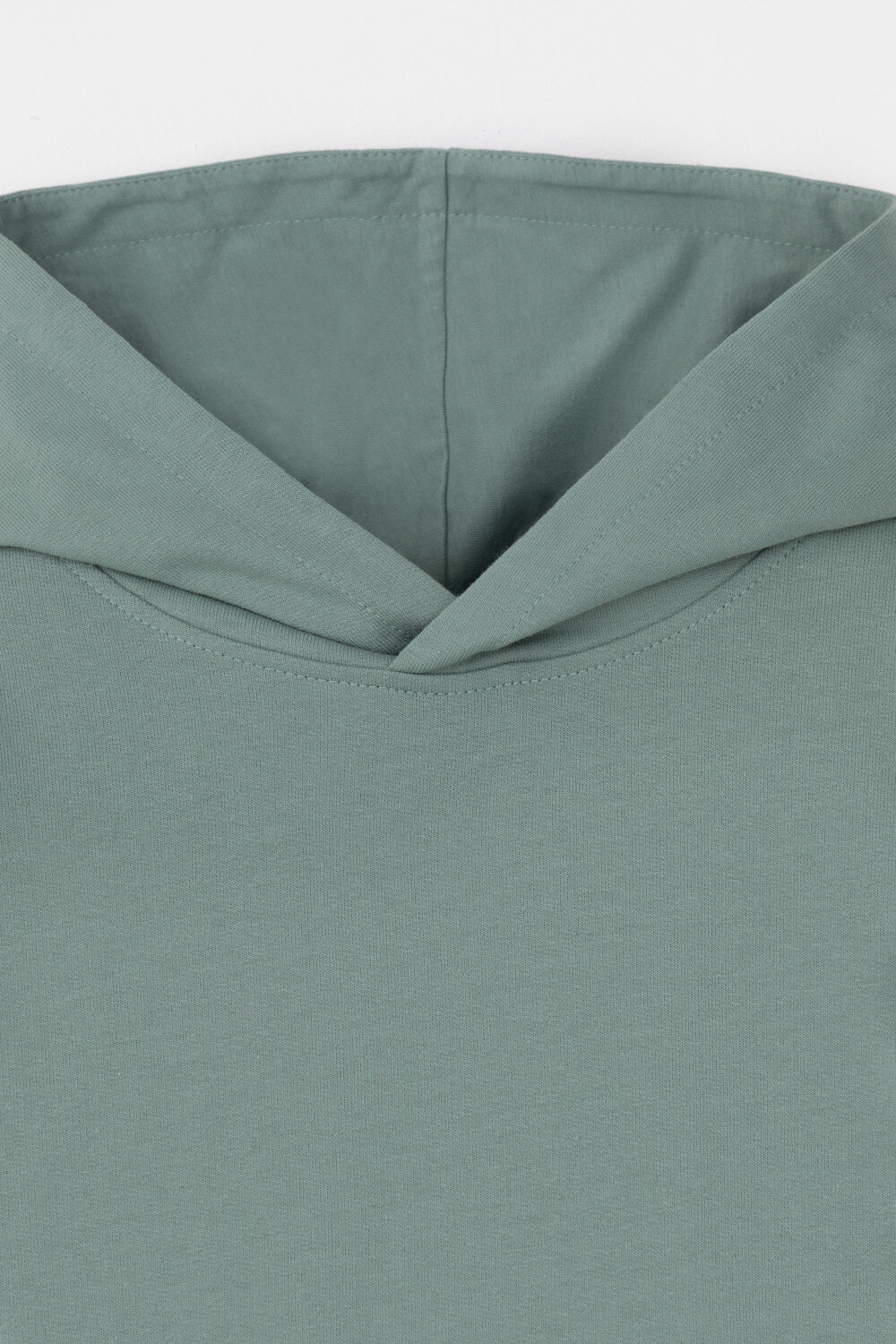 Однотонная трикотажная толстовка с капюшоном из петельчатого футера. Спереди удобный накладной карман-кенгуру. Манжеты и пояс из эластичного трикотажа в рубчик.