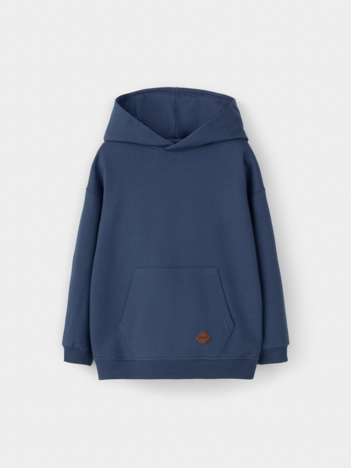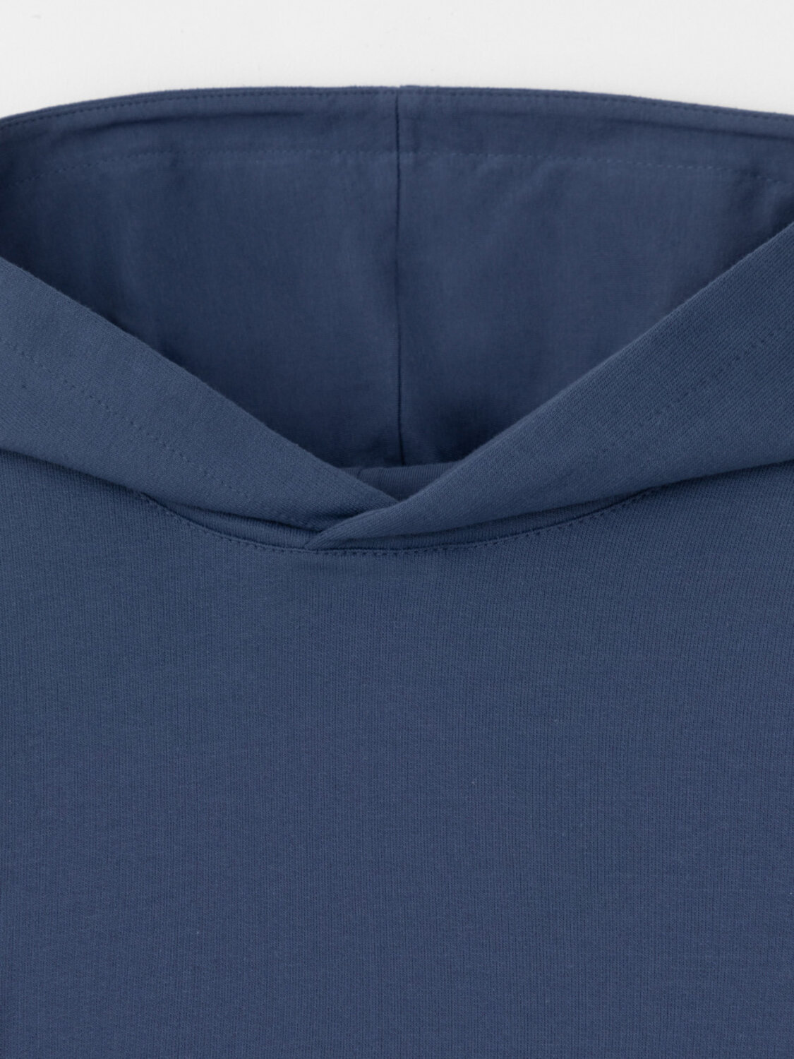 Однотонная трикотажная толстовка с капюшоном из петельчатого футера. Спереди удобный накладной карман-кенгуру. Манжеты и пояс из эластичного трикотажа в рубчик.