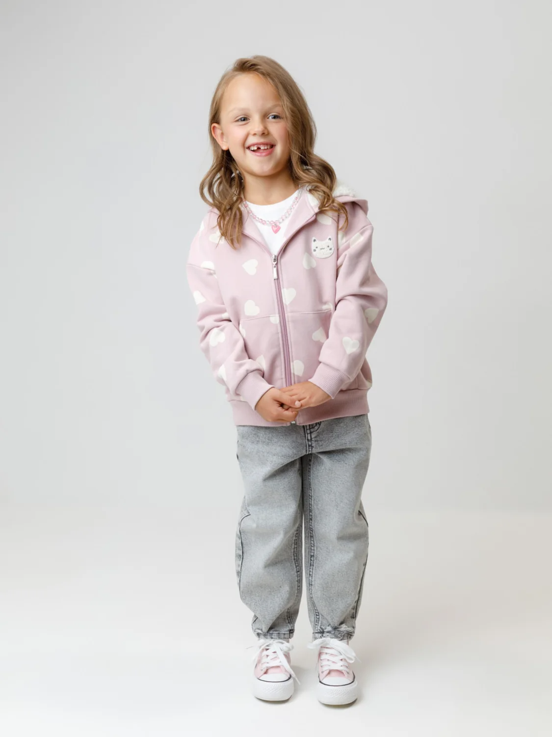Толстовка для девочки со спущенными плечами. Изготовлена из высококачественного петельчатого футера трёхнитки. Застёгивается на молнию. В капюшоне мягкий подклад из флиса с длинным ворсом. Манжеты и пояс выполнены из эластичного полотна. Спереди удобный вместительный карман-кенгуру. Изделие сохраняет цвет и форму после многократных стирок. Все трикотажные полотна производятся в соответствии с нормами швейцарского сертификата ЭкоТекс.
