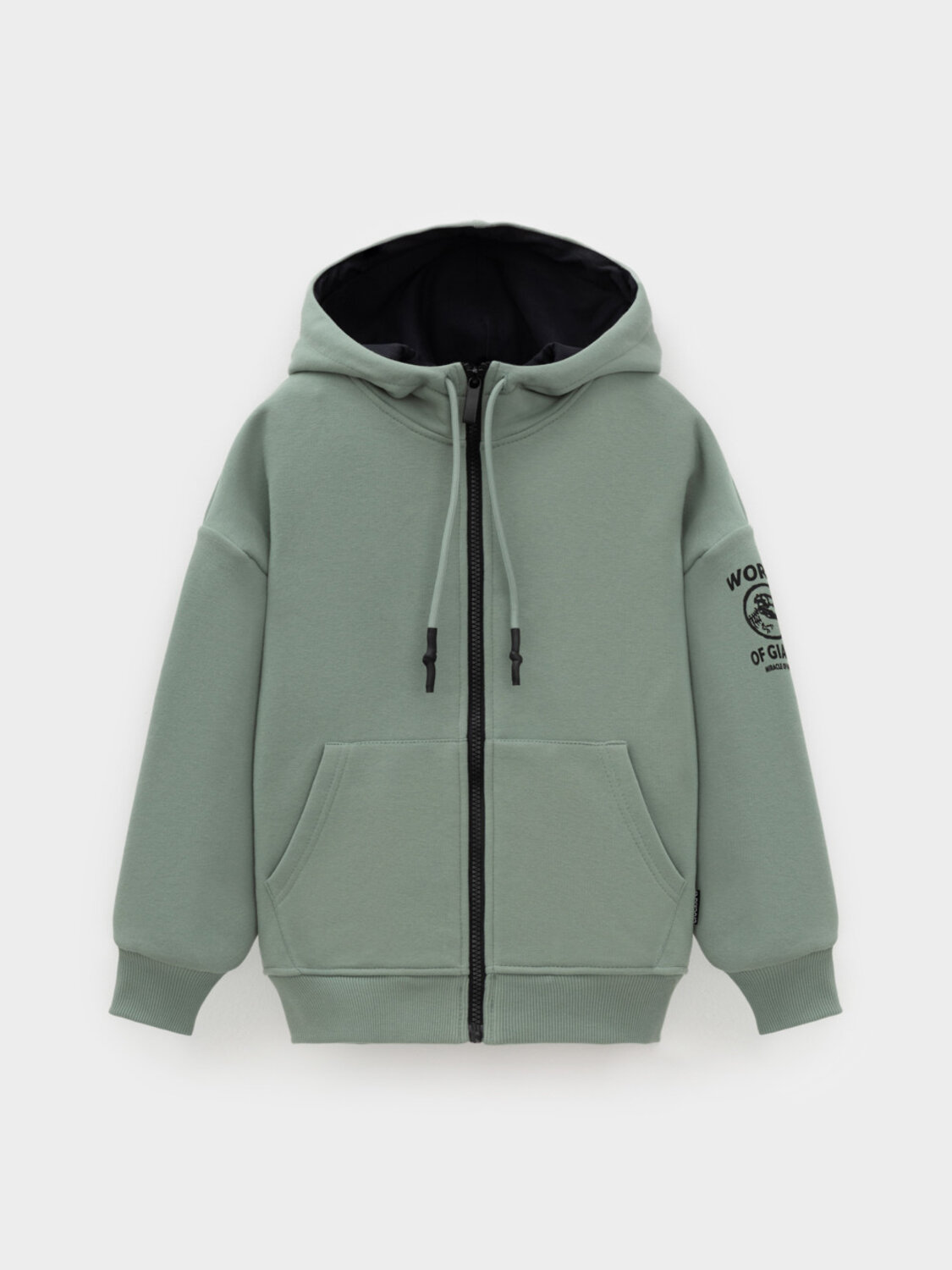 Толстовка с капюшоном для мальчика из тёплого футера с начёсом. Пояс и манжеты выполнены из мягкого эластичного трикотажа. Застёгивается на молнию. Спереди удобный и вместительный карман-кенгуру. Худи сохраняет форму и стойкий цвет после многочисленных стирок и идеально подходит на каждый день. Оригинальный принт выполнен из стойких текстильных гипоаллергенных красителей. Все трикотажные полотна производятся в соответствии с нормами швейцарского сертификата ЭкоТекс.