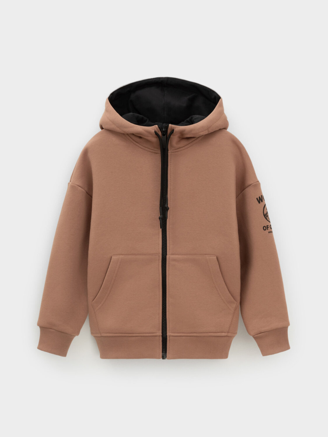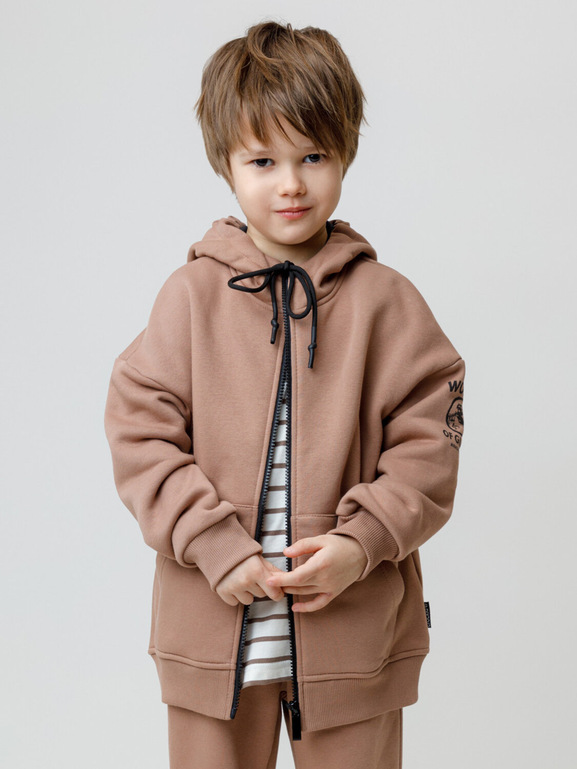 Толстовка с капюшоном для мальчика из тёплого футера с начёсом. Пояс и манжеты выполнены из мягкого эластичного трикотажа. Застёгивается на молнию. Спереди удобный и вместительный карман-кенгуру. Худи сохраняет форму и стойкий цвет после многочисленных стирок и идеально подходит на каждый день. Оригинальный принт выполнен из стойких текстильных гипоаллергенных красителей. Все трикотажные полотна производятся в соответствии с нормами швейцарского сертификата ЭкоТекс.