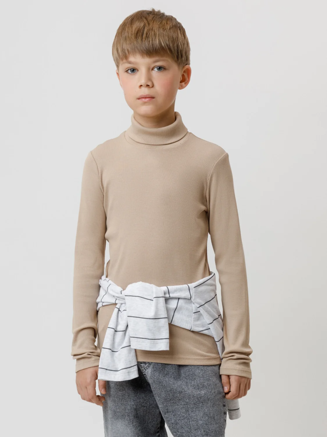 Однотонная водолазка из эластичного трикотажа в рубчик для мальчика. Изделие сохраняет форму и стойкий цвет после многочисленных стирок и идеально подходит на каждый день. Все трикотажные полотна производятся в соответствии с нормами швейцарского сертификата ЭкоТекс.
