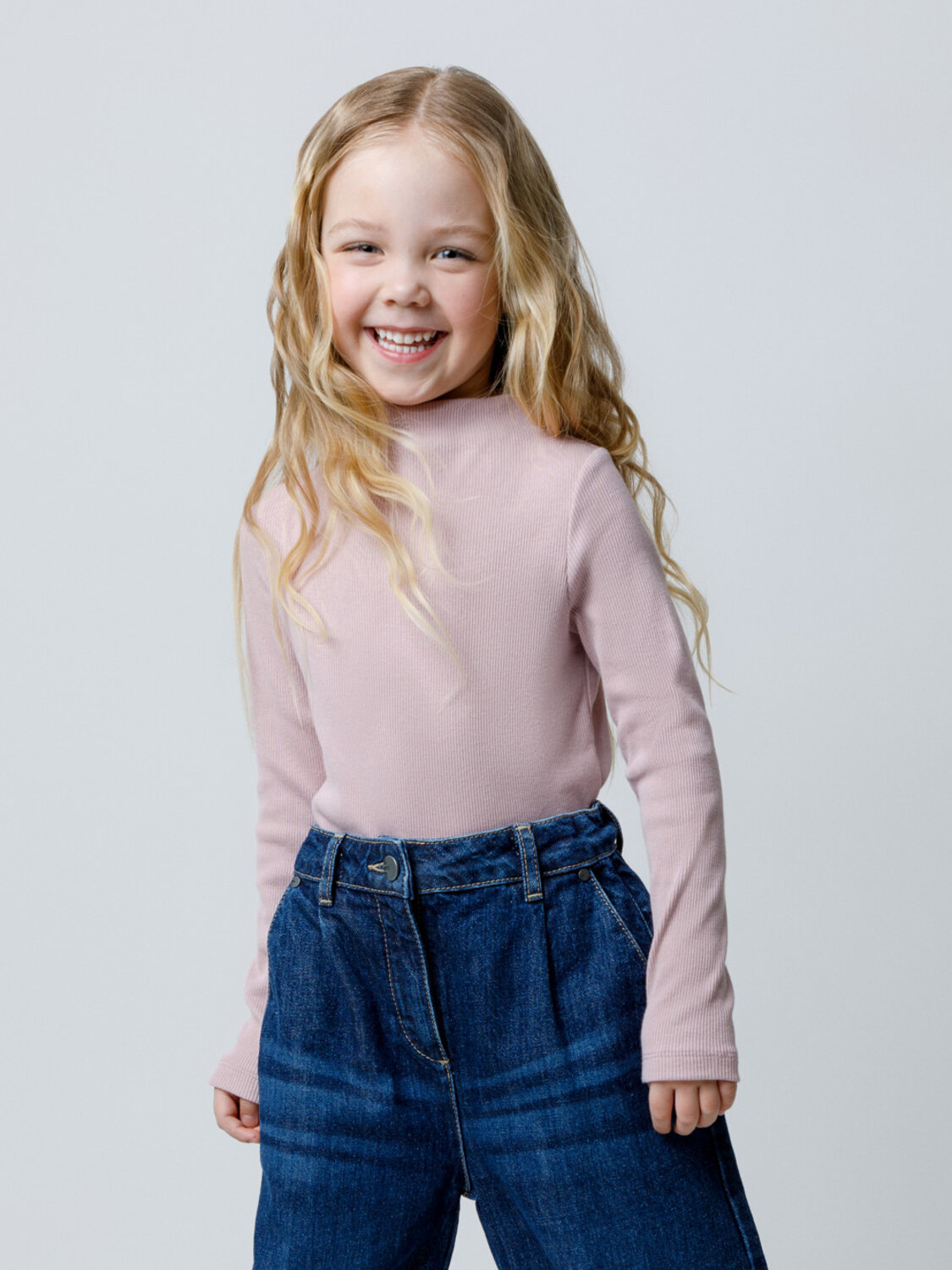 Базовая водолазка для девочки из эластичного трикотажа кашкорсе. Изделие имеет цельнокроенный воротник и длинные втачные рукава. Водолазка сохраняет цвет и форму после многократных стирок.