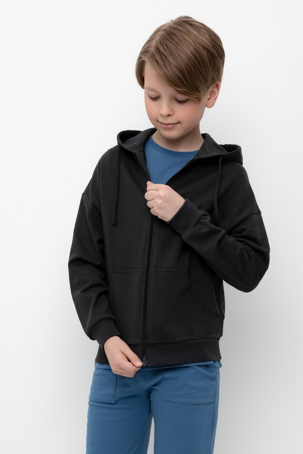 Трикотажная куртка для мальчика из петельчатого футера. Спереди удобные накладные карманы. Манжеты и пояс из эластичного трикотажа в рубчик.