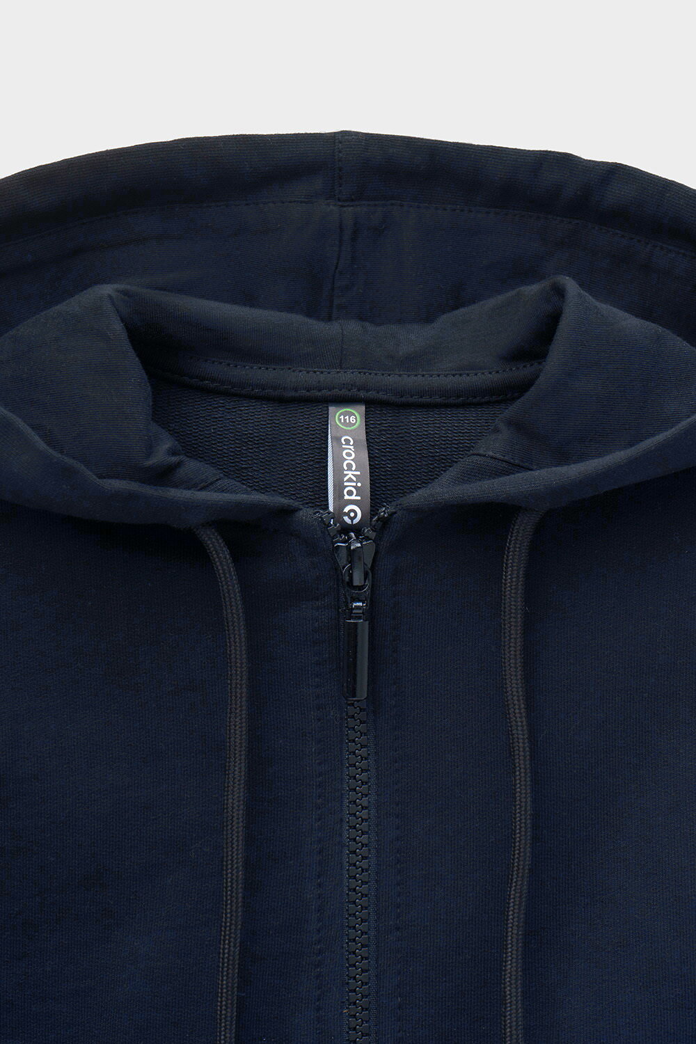 Трикотажная куртка на молнии из петельчатого футера. Спереди удобные накладные карманы. Манжеты и пояс из эластичного трикотажа в рубчик.