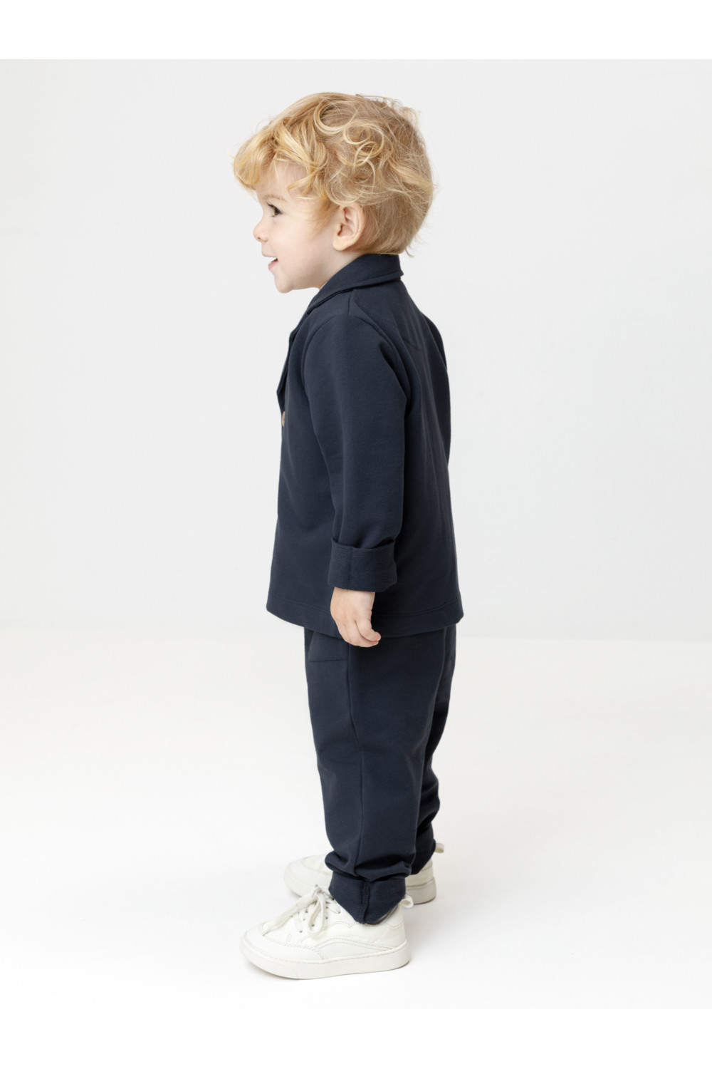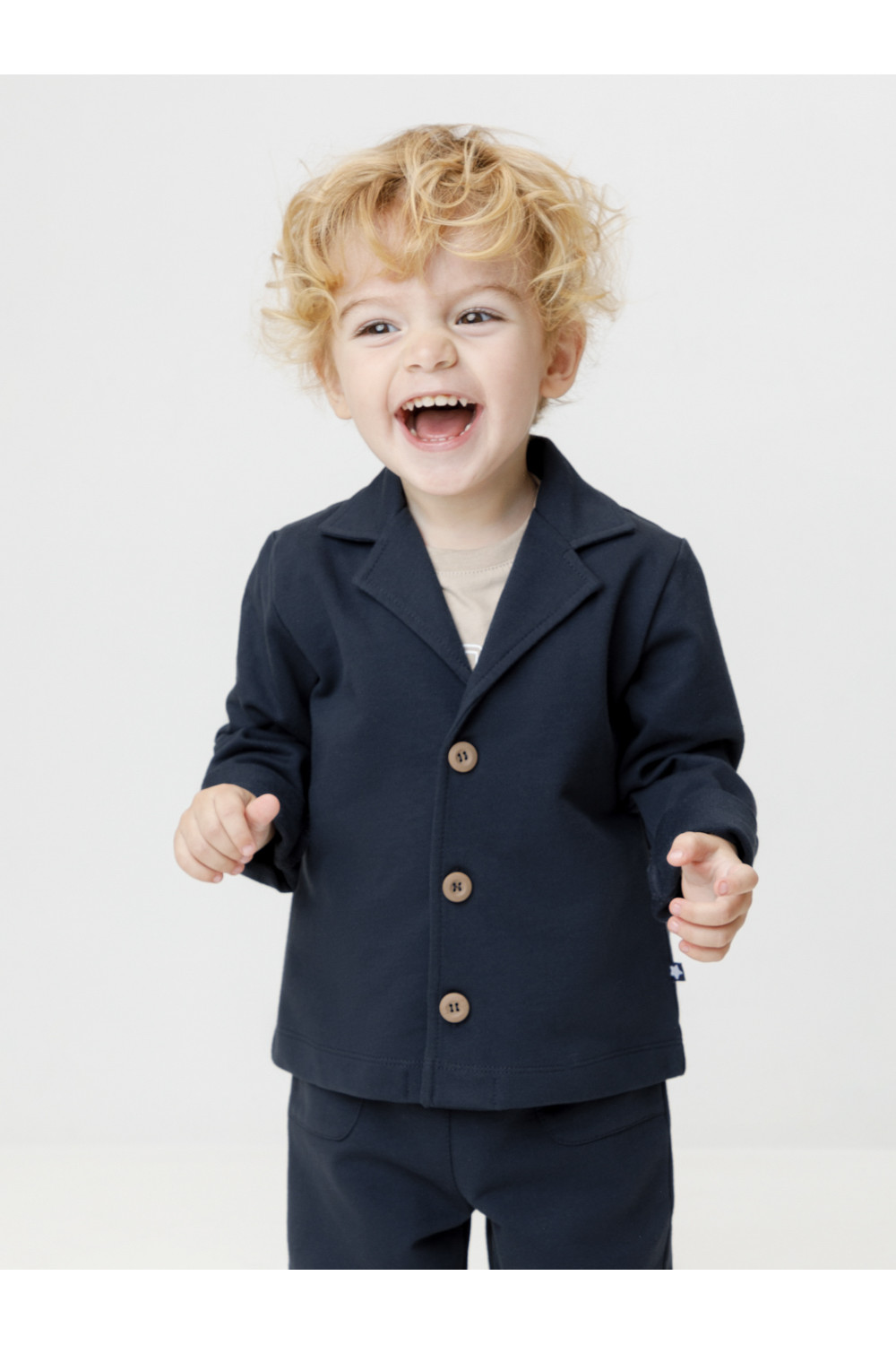 Трикотажный пиджак для мальчика из однотонного петельчатого футера. Спереди удобная застёжка на пуговицы. Изделие сохраняет цвет и форму после многократных стирок. Все трикотажные полотна производятся в соответствии с нормами швейцарского сертификата ЭкоТекс.