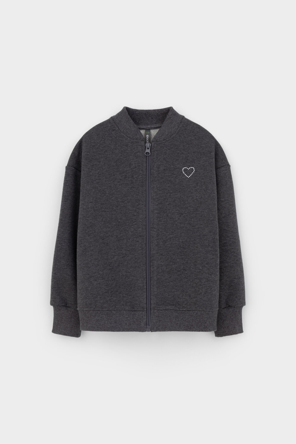 Трикотажная куртка для девочки из петельчатого футера трехнитки. По бокам выполнены карманы, манжеты и пояс из эластичного трикотажа в рубчик. На груди аппликация из страз