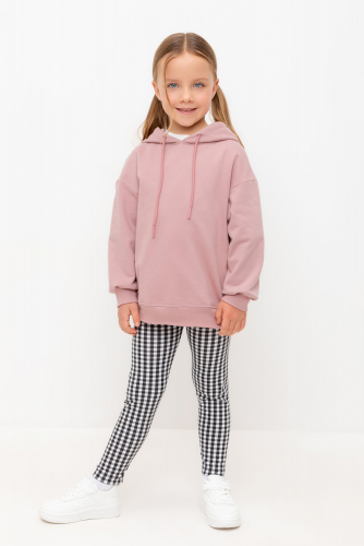 Свободная трикотажная рубашка для девочки из петельчатого футера на кнопках. Модель с закругленным низом и спущенным плечом.