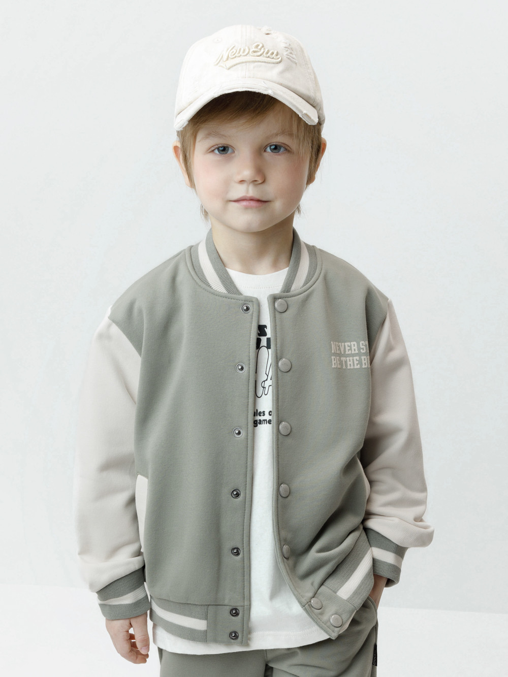 Бомбер для мальчика с контрастными рукавами из мягкого трикотажа. В составе 80% натурального хлопка и 20% полиэстера, при этом полиэстер ввязан внутрь по особой технологии и не соприкасается с кожей. Застёгивается на кнопки. Воротник, манжеты и пояс вязаные. Спереди два кармана. Изделие сохраняет цвет и форму после многократных стирок. Все трикотажные полотна производятся в соответствии с нормами швейцарского сертификата ЭкоТекс.
