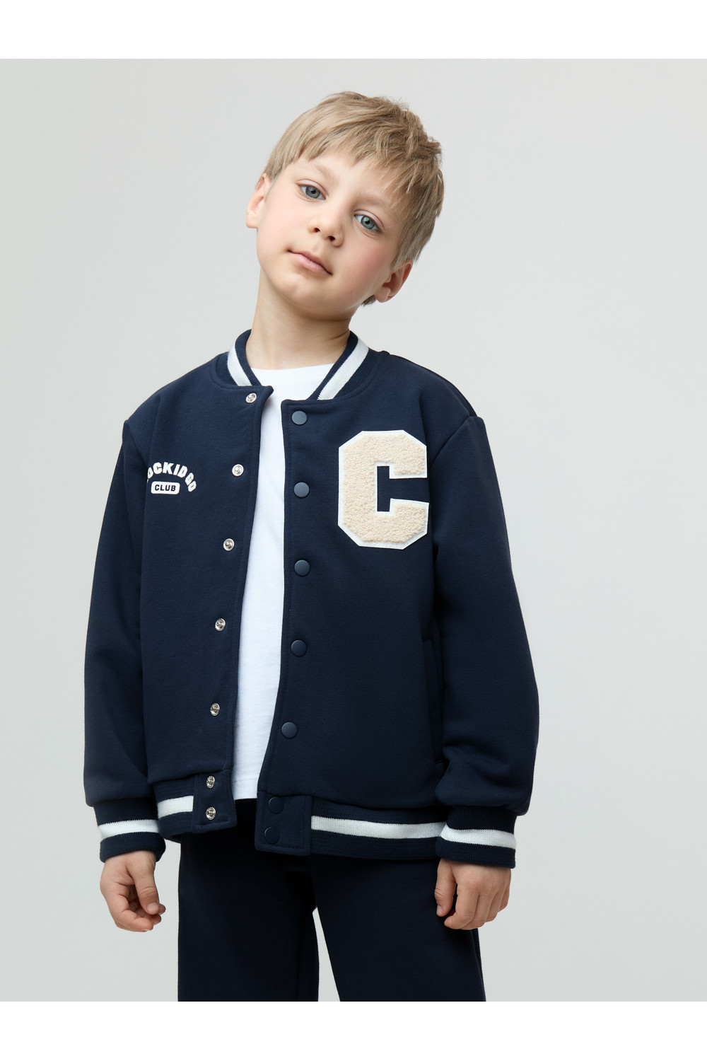 Бомбер для мальчика из мягкого трикотажа. В составе 80% натурального хлопка и 20% полиэстера, при этом полиэстер ввязан внутрь по особой технологии и не соприкасается с кожей. Застёгивается на кнопки. Воротник, манжеты и пояс вязаные. Спереди два кармана. Изделие сохраняет цвет и форму после многократных стирок. Все трикотажные полотна производятся в соответствии с нормами швейцарского сертификата ЭкоТекс.