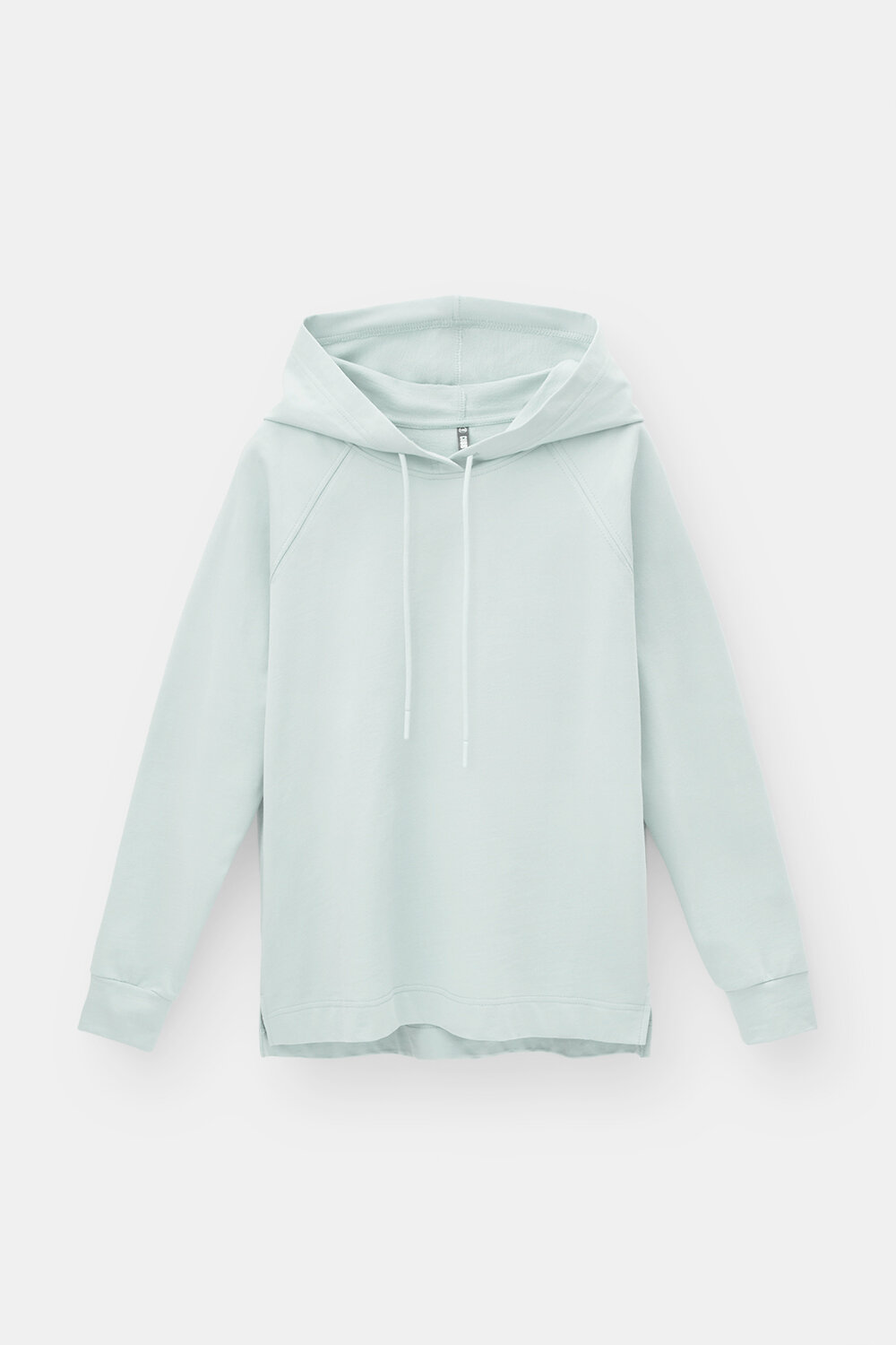 Толстовка однотонная с капюшоном и боковыми карманами из петельчатого футера. Рукава реглан, манжеты из основного полотна. Свободный силуэт. Все трикотажные изделия производятся в соответствии с нормами Швейцарского сертификата ЭкоТекс.