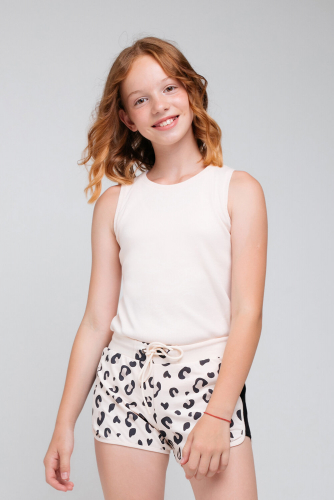 Хлопковые шорты для девочки с широким поясом на резинке. Сшиты из футера петли с набивным леопардовым рисунком. Ширина регулируется с помощью шнурка. По бокам вставки. Край обработан кантом.