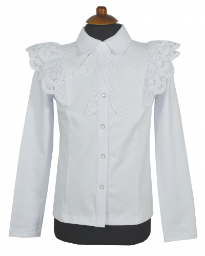 Блузка для девочки из трикотажного полотна высокого качества с добавлением эластана. Отложной воротник из трикотажной ткани. Застежка на кнопки. Рукав с крылышками в два слоя из кружевного полотна. Спинка без особенностей. Брошь в комплекте, застегивается на пуговицы под воротником. Красиво смотрится и без броши.