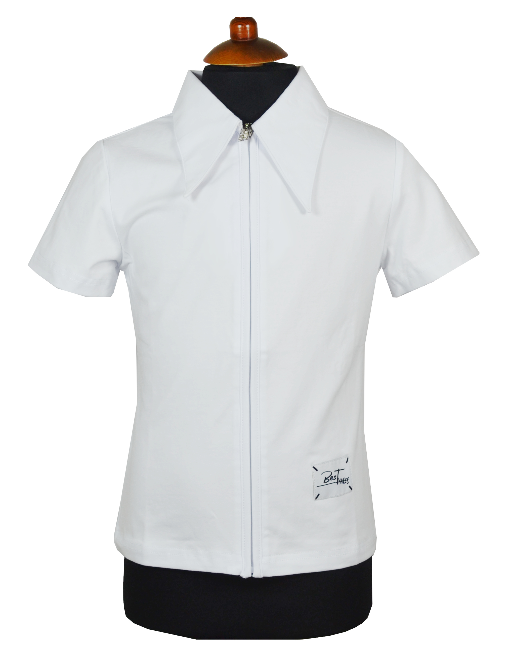 Трикотажная блузка на замке с отложным воротником. Украшением блузки служит нашитый шеврон.  Застежка на замок. Ткань не тонкая, не просвечивает, с добавлением эластана, высокого качества. Спинка изделия без особенностей.