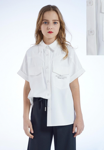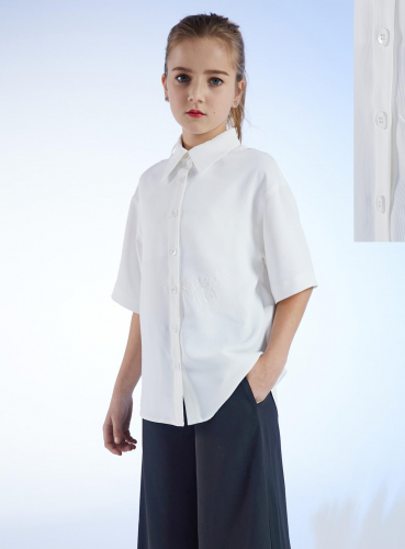 Блузка с коротким рукавом из вискозной ткани свободного кроя. Отложной воротник. Спинка без особенностей. Застежка на пуговицы. Практичная вещь на каждый день. Спущенное плечо. Рукав короткий.  Нанесена надпись. Ткань шифон.