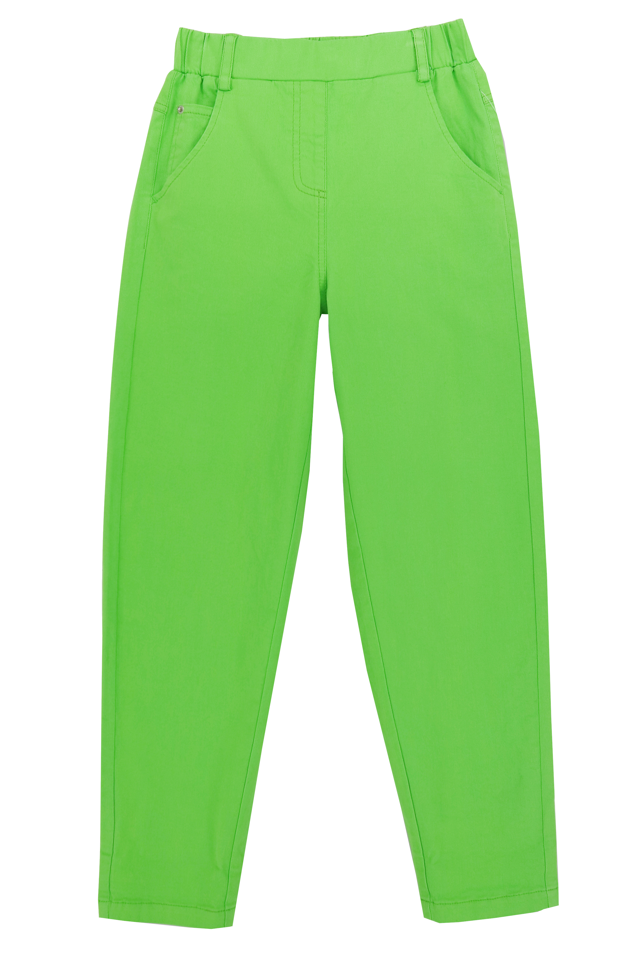Брюки для девочки из плотной ткани типа джинса. Пояс на резинке. Функциональные карманы.  Крой не узкий. Низ можно подкатать.