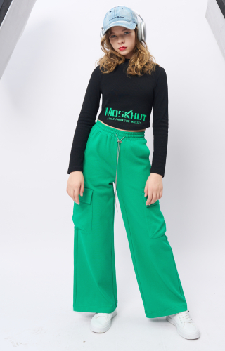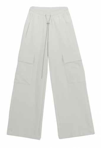 Брюки для девочки из трикотажной ткани. Пояс на резинке, дополнен шнурком. Функциональные карманы. Трикотаж плотный. Нашиты накладные карманы.
