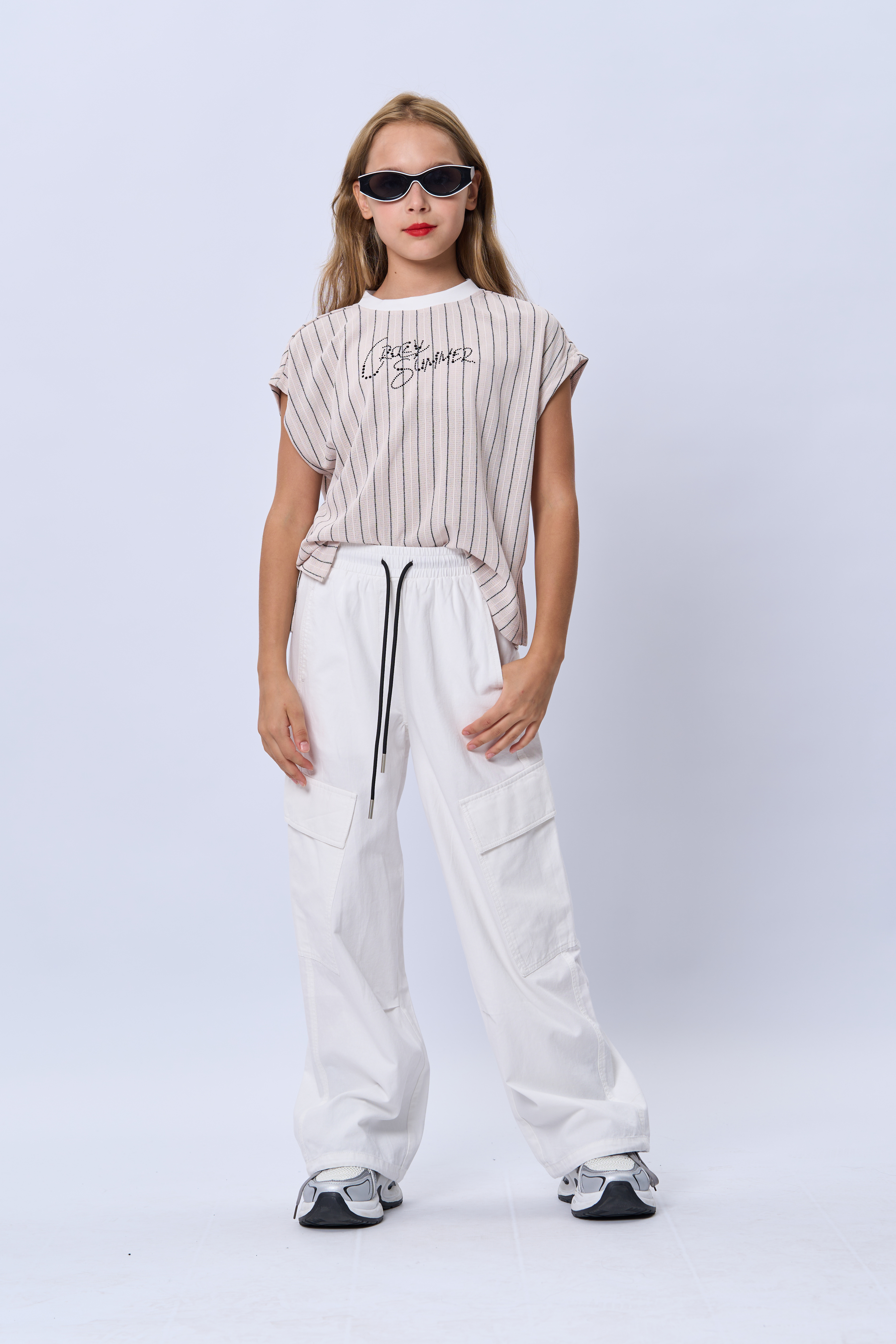 Брюки для девочки из хлопковой ткани. Пояс на резинке. Функциональные карманы. По низу можно затянуть на резинку. Сезон лето.