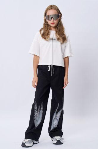 Брюки для девочки из хлопковой ткани. Пояс на резинке. Функциональные карманы. По низу можно затянуть на резинку. Сезон лето. Нанесен принт контрастный по цвету.