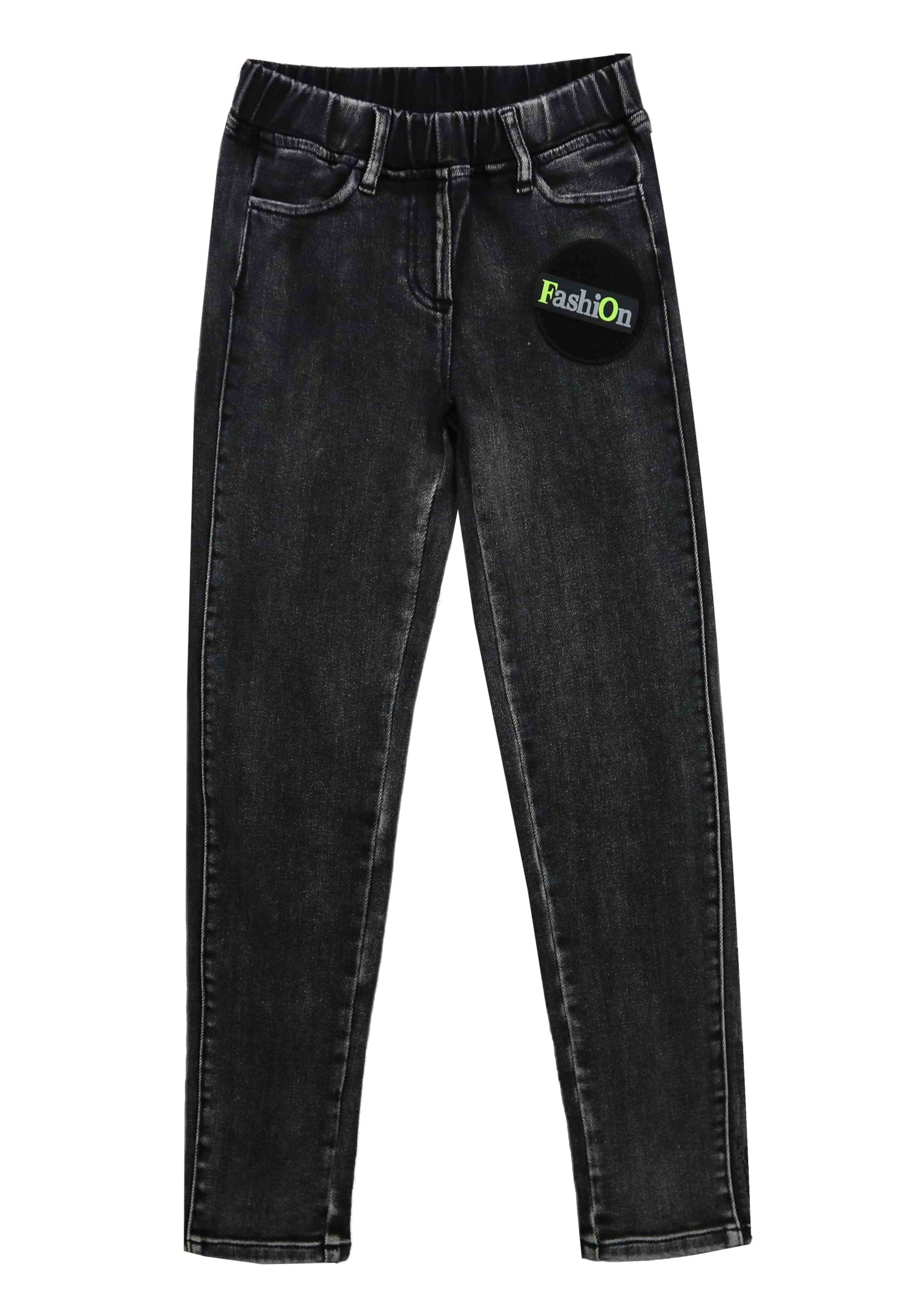 Джинсы для девочки на поясе резинке. Облегающий крой. Ткань немного тянется. Дополнены шевроном.