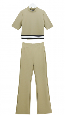 Комплект для девочки. В комплект входит футболка и брюки клеш. Футболка по низу на трикотажной резинке. Брюки-клеш на поясе резинке с функциональными карманами. Ткань средней плотности.