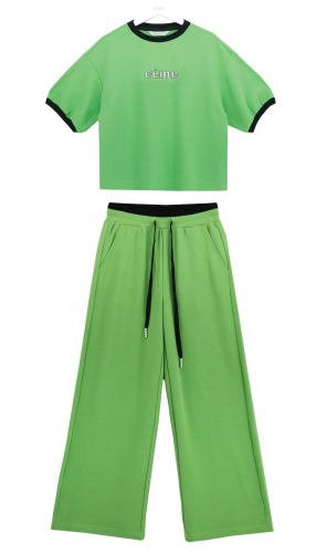 Комплект для девочки в спортивном стиле. Футболкасвободного кроя со спущенным плечом. Брюки-кюлоты на поясе резинке с функциональными карманами. Ткань средней плотности.