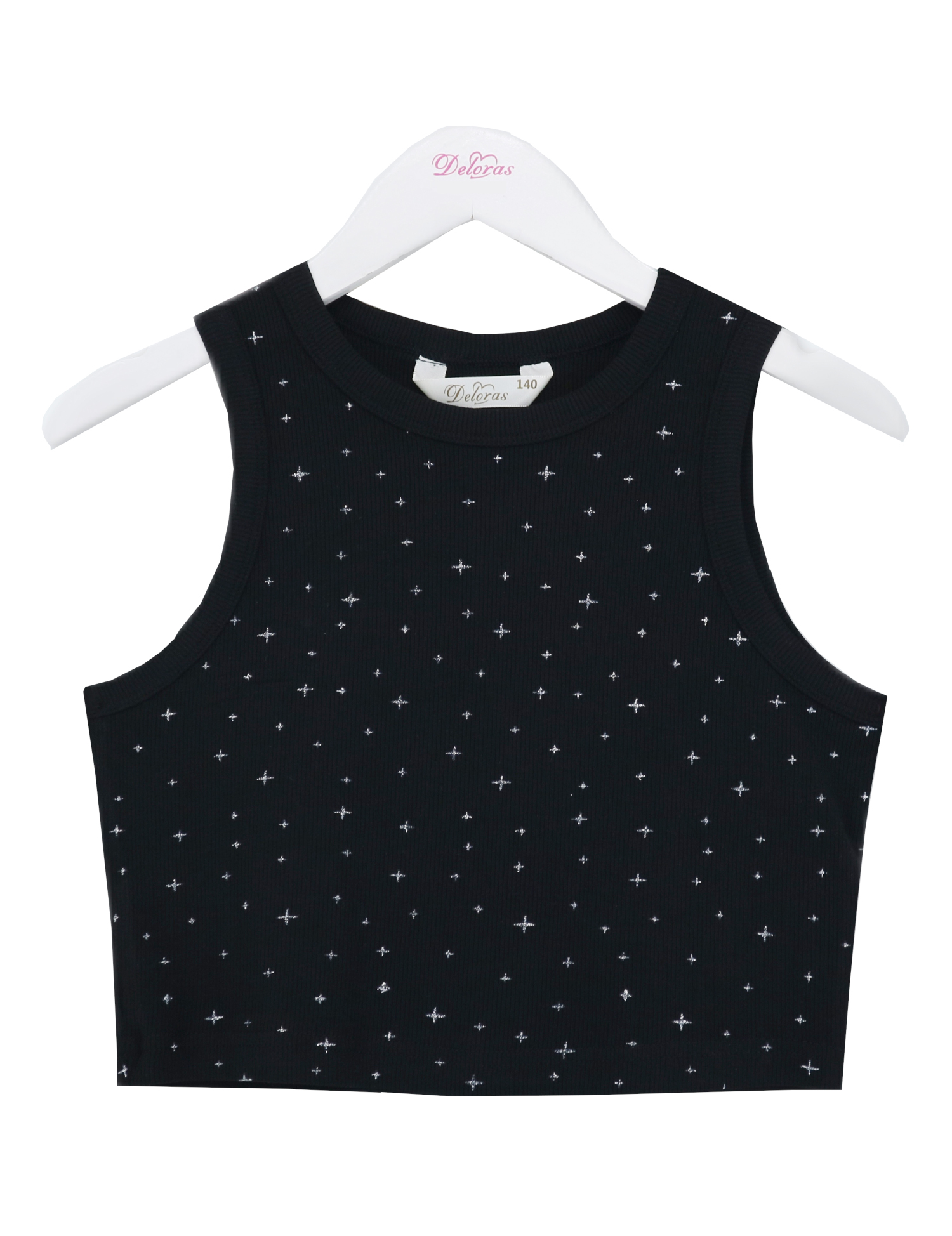 Майка  для девочки. Выполнена из качественного вискозного полотна с добавлением эластана. Дополнена принтом в виде серебристых звездочек.