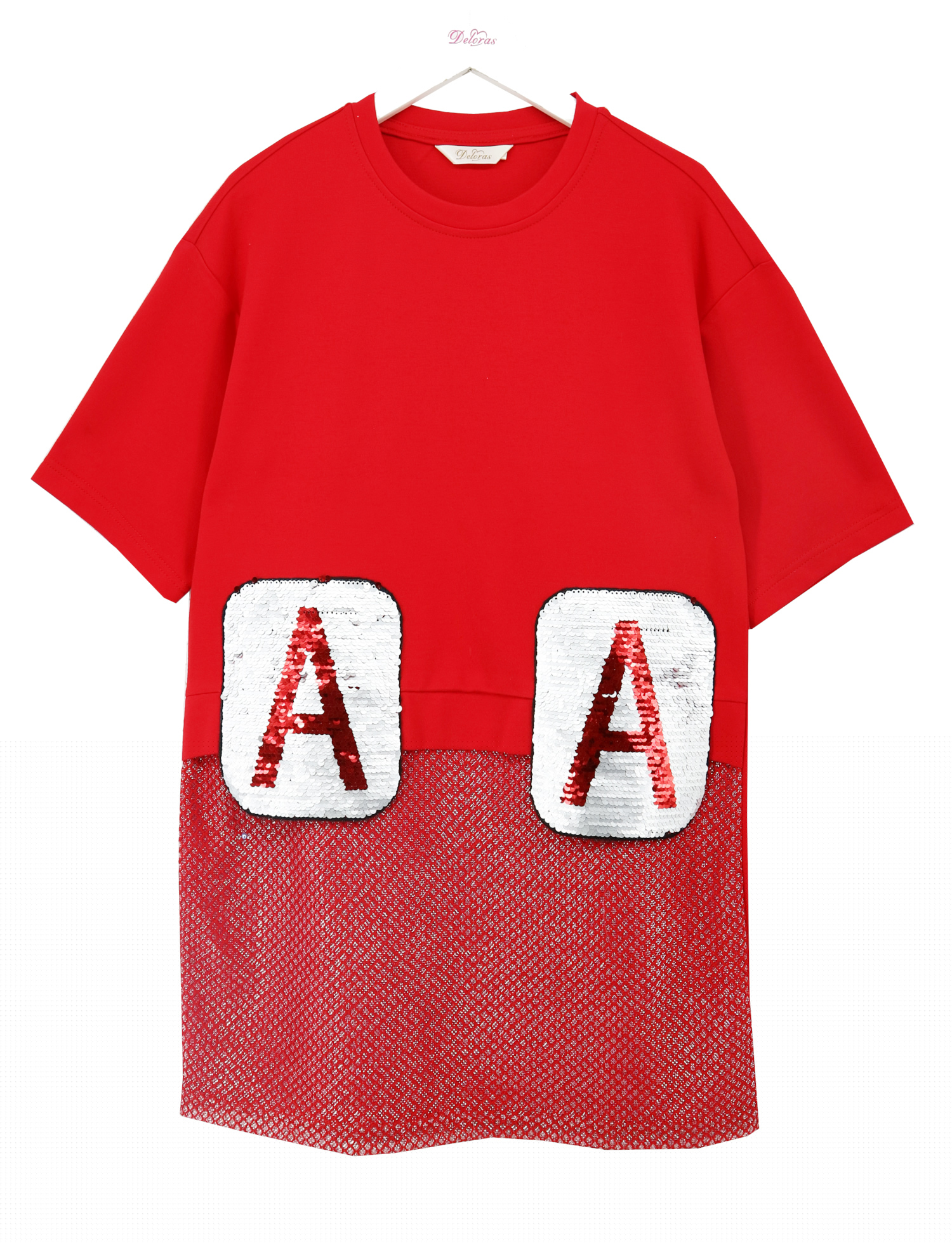 Модное платье с коротким рукавом для девочек. Изделие выполнено из высококачественного трикотажа. Модель дополнена пайетками-перевертышами. Низ платья с наложением сетки.