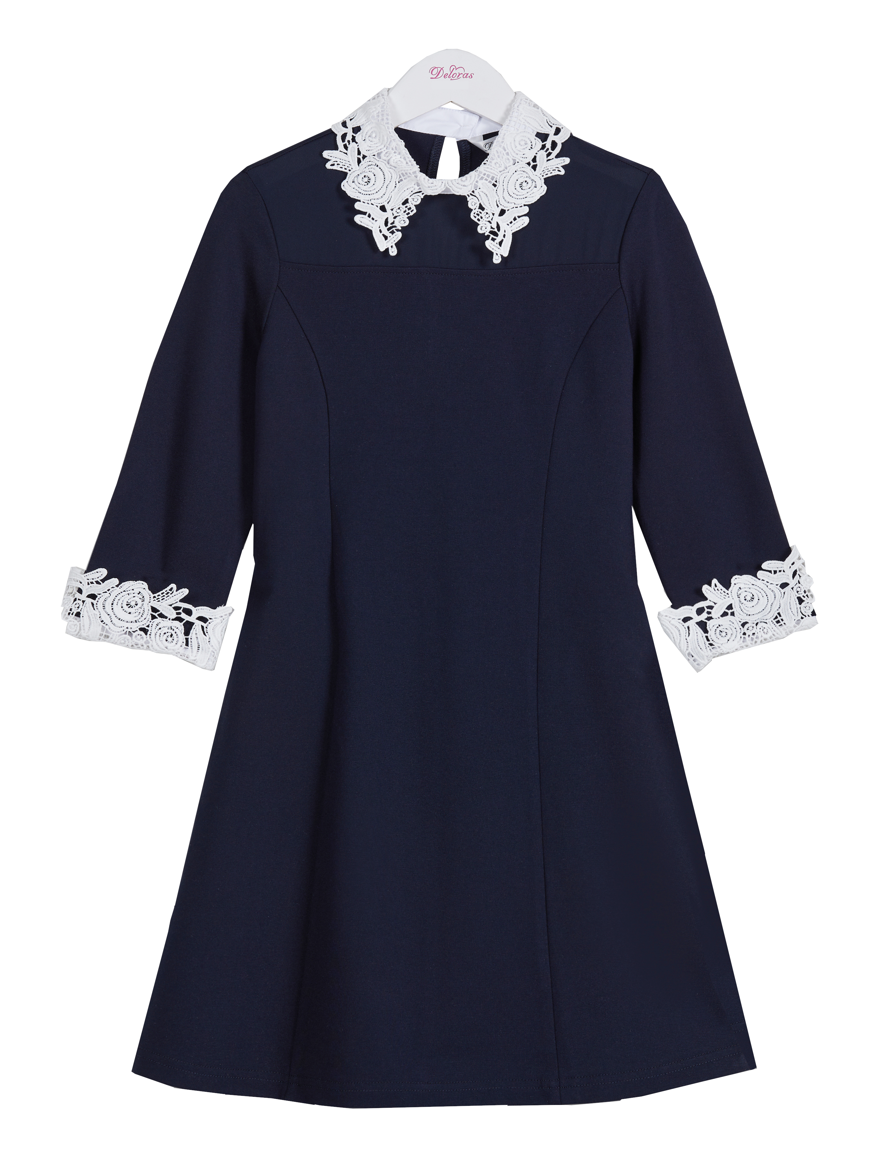 Платье для девочки с отложным воротником из трикотажного полотна высокого качества. Застежка на пуговицу по спинке.  Воротник и манжеты из кружевного полотна. Воротник не отстегивается. Манжеты пристегиваются на пуговицы, можно носить и без них. Прорезные карманы в боковых швах. Очень удобная вещь  и эффектная для повседневной носки в школе.