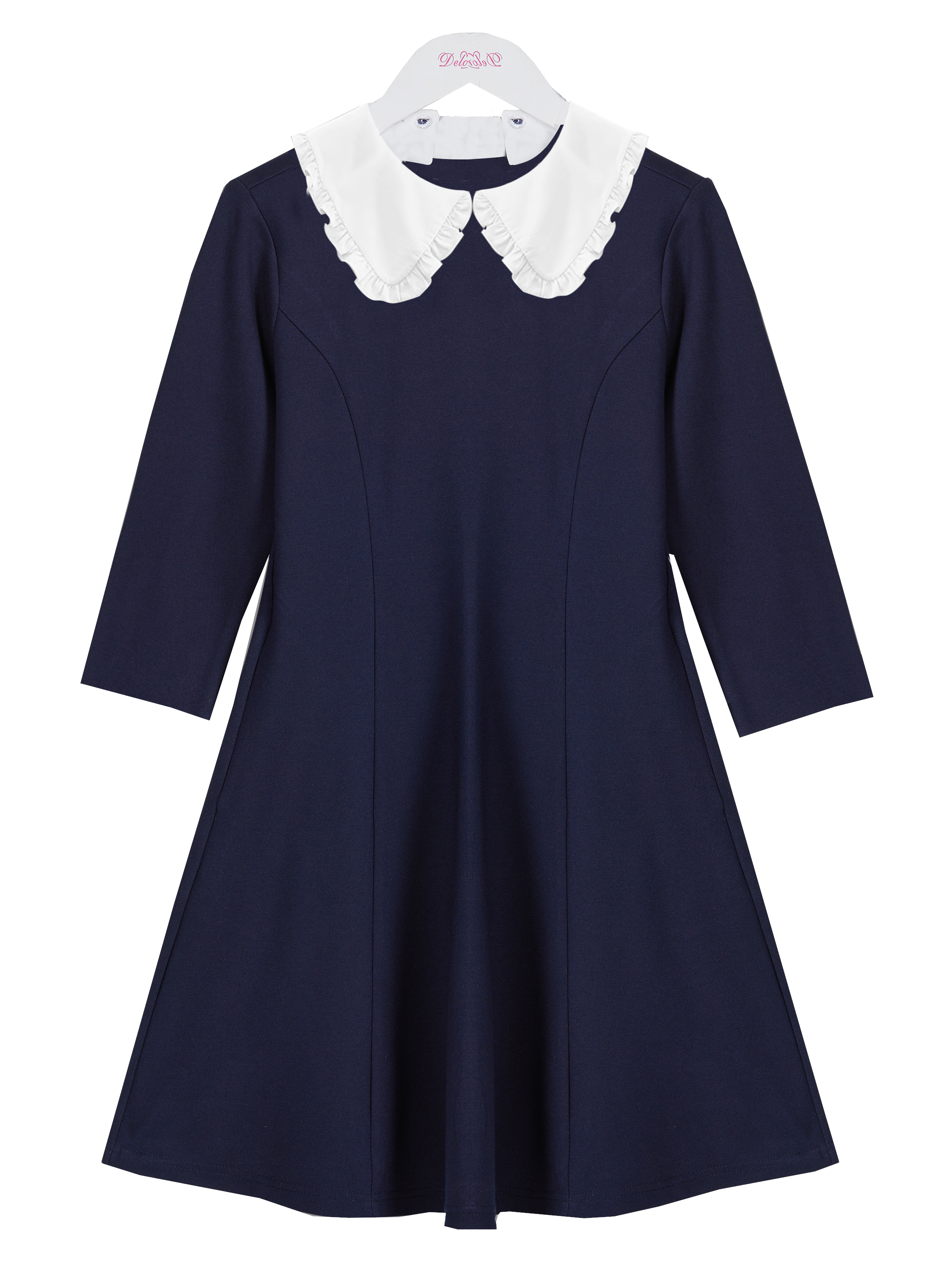 Платье для девочки с отложным воротником из трикотажного полотна высокого качества. Воротник не отстегивается. Рукав 3/4 длины. Прорезные карманы в боковых швах. Очень удобная вещь  и эффектная для повседневной носки в школе.