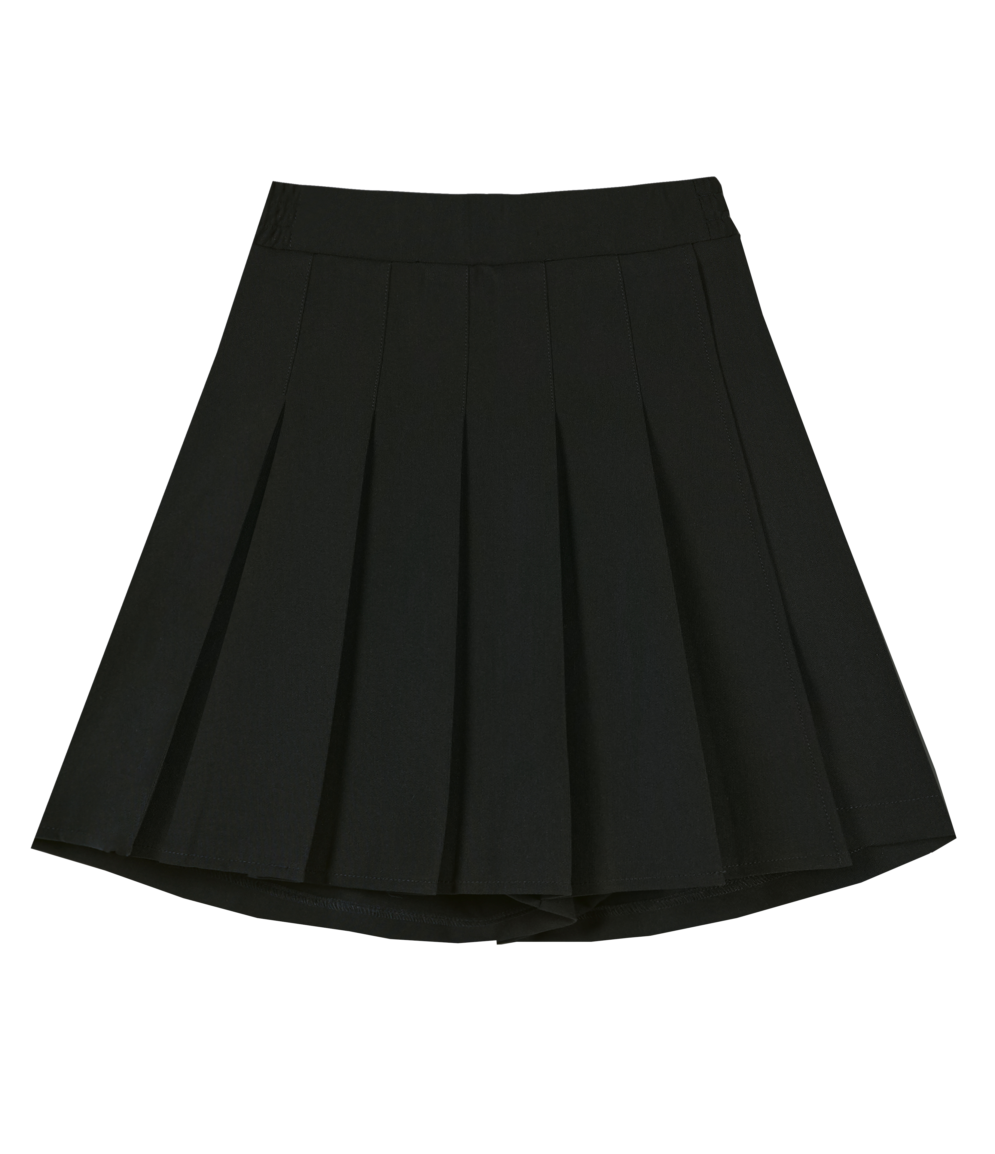 Юка-шорты школьные для девочки из костюмной ткани. Переднее полотно выполнено в складку. Ближе к поясу складки зафиксированы строчкой. Вид сзади-шорты. Пояс на резинке по спинке. Карманы функциональные.  Пошив безупречный.