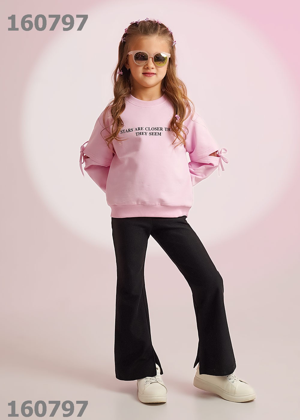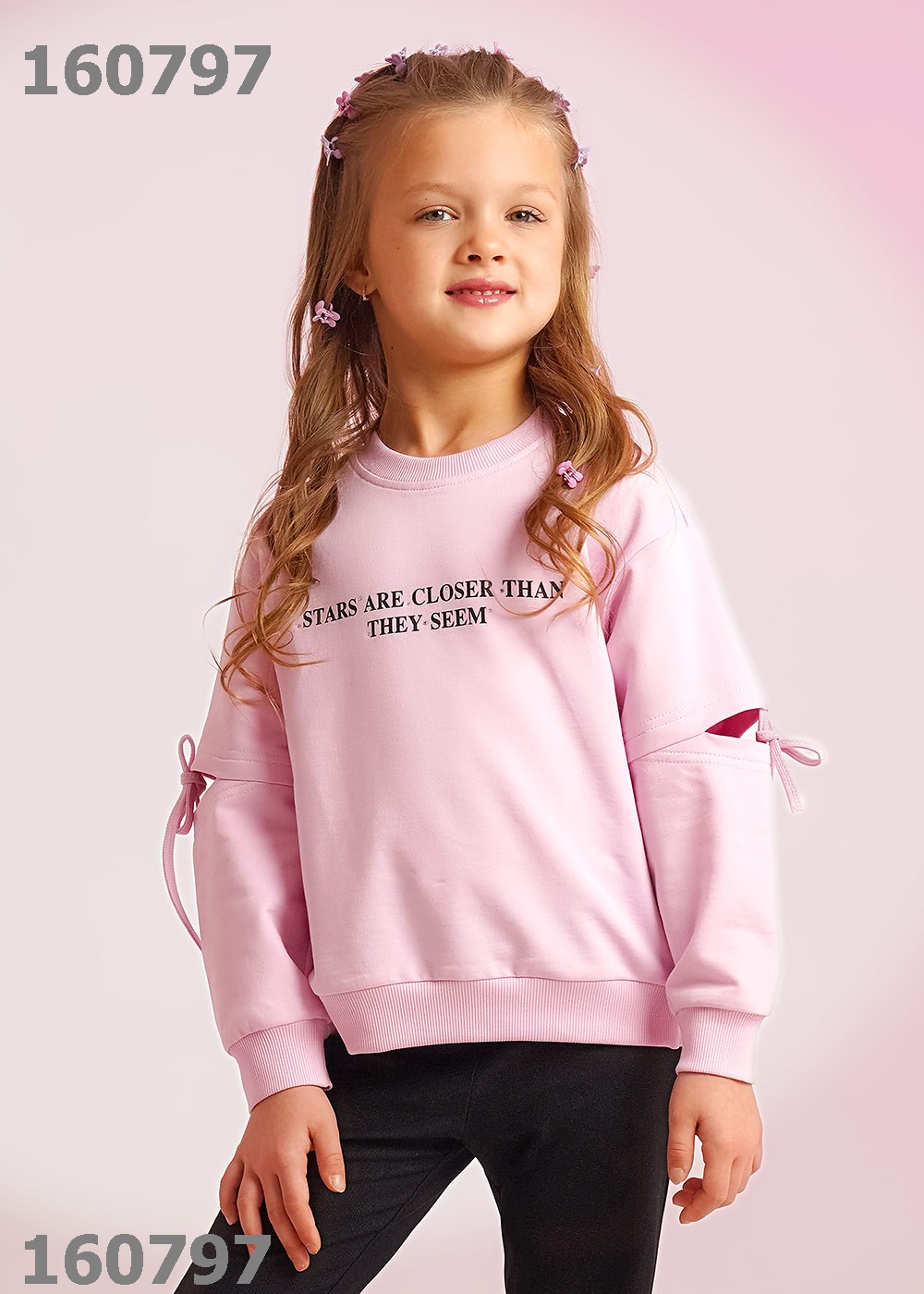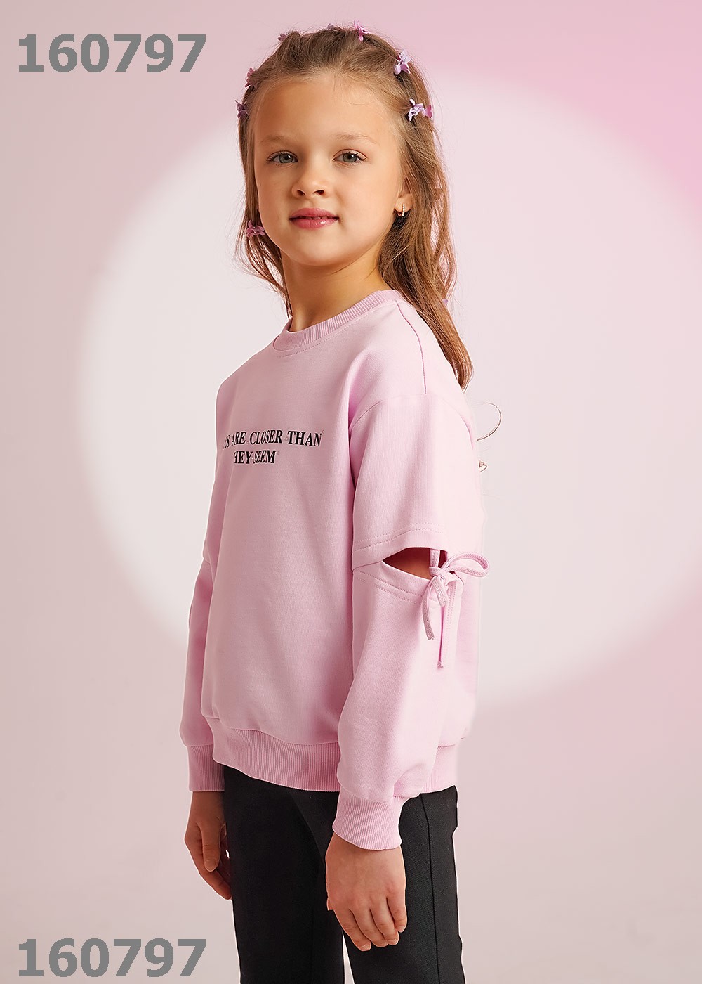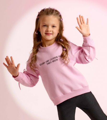 "Описание: Трендовый свитшот из футера станет прекрасным дополнением к твоему гардеробу! Спереди стильный принт со стразами, по рукавам разрезы с завязками - всё, для твоих ярких и неповторимых образов! Сочетай модель с брюками и юбками из новой коллекции!