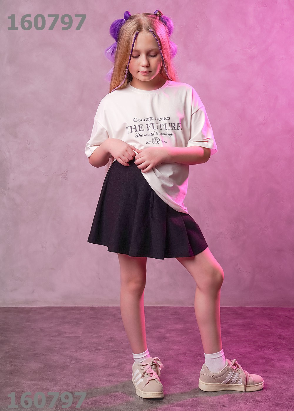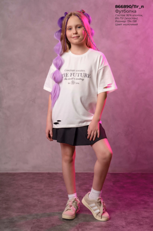 "Описание: Стильная футболка с прорезями из хлопка с эластаном прекрасно дополнит твой гардероб. Модель кроя оверсайз дополнена эластичной горловиной и стильным принтом.Создавай стильные яркие образы,сочетая модель с юбкой или брюками из новой коллекции
