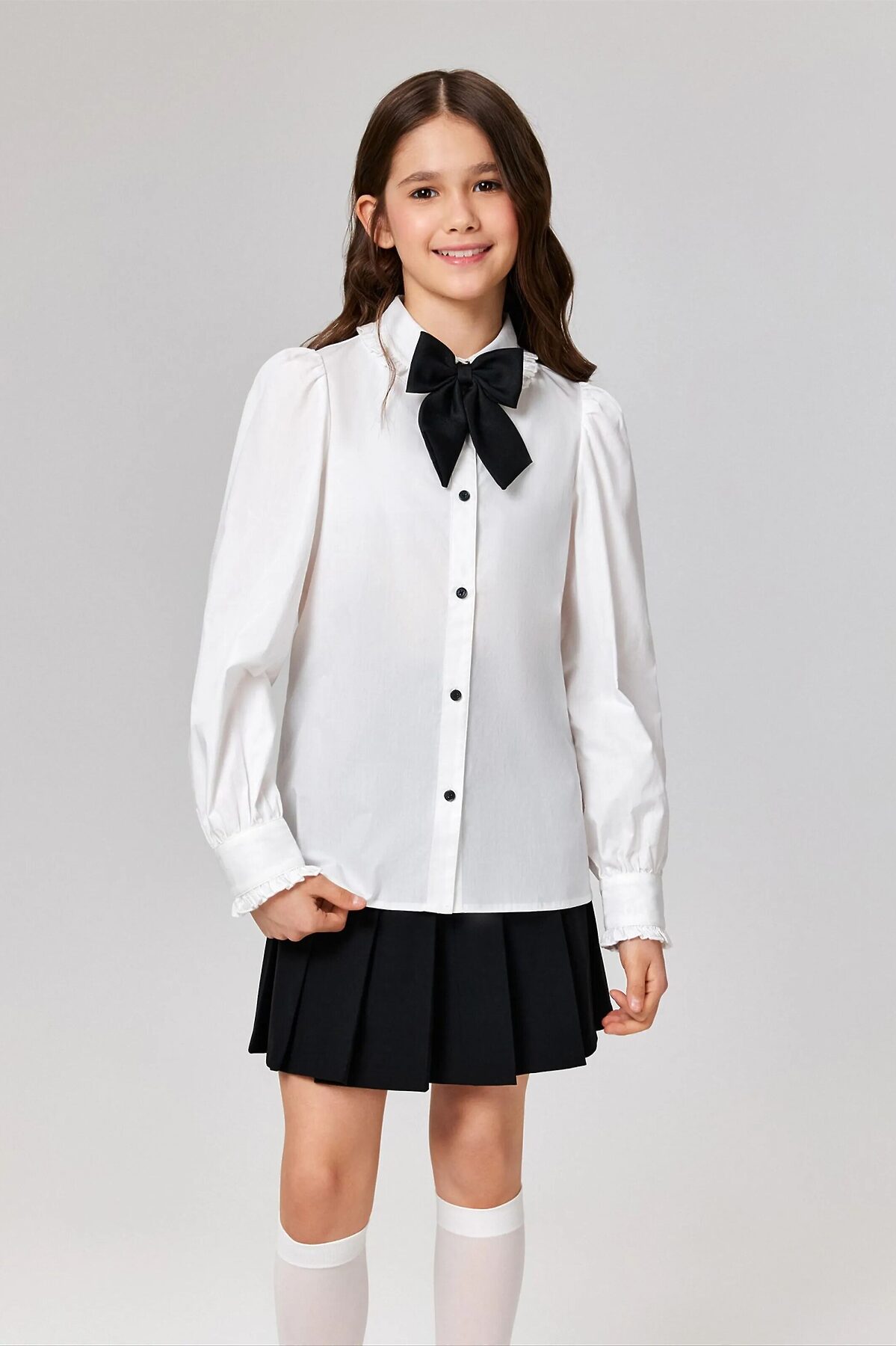 Детская блузка с бантом для девочки изготовлена из мягкого и дышащего хлопка, обеспечивающего комфортное ношение на протяжении всего дня. Модель прямого силуэта со стандартной линией плеч удобно садится на разные типы фигур. Спереди расположена центральная застежка на контрастные пуговицы. Длинные объемные рукава, присборенные у плеч, оканчиваются манжетами на пуговицах. Рубашечный воротник придает модели завершенный строгий вид. Главное украшение модели — съемный черный бант на эластичной тесьме с застежкой на крючок. Воротник и манжеты декорированы рюшами из основного материала, придающими образу нежную нотку. Белая блузка станет отличной базой для школьной формой, а также составит отличный аутфит для учебы с юбкой в складку и белыми гольфами.