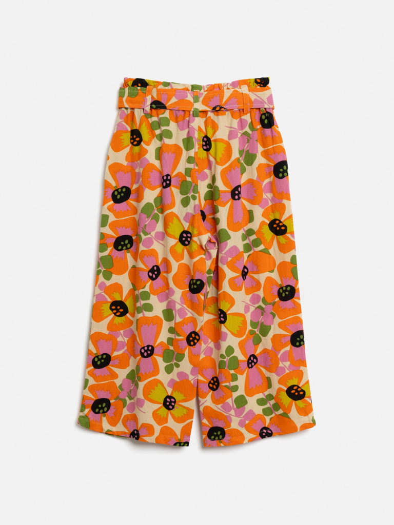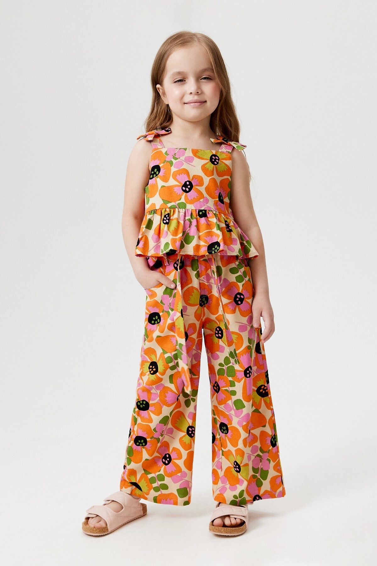 Детские свободные брюки для девочки станут стильным дополнением к летнему образу юной модницы. Изделие выполнено из смесовой ткани, которая обеспечивает комфорт в ношении. Прямой силуэт подходит для разных типов фигур. Яркий цветочный принт делает образ более запоминающимся. Два боковых кармана добавляют изделию практичности и функциональности. Линия талии обработана эластичной лентой, что обеспечивает комфортную посадку. Съемный пояс позволяет регулировать объем изделия по необходимости. Модель представлена в двух вариантах: разноцветном с цветочками и в зеленом с цветочками. Стилизуйте брюки с комплектным топом (20220270075) для создания гармоничного образа на прогулки в теплое время года. Рост и размер модели на фото 110.
