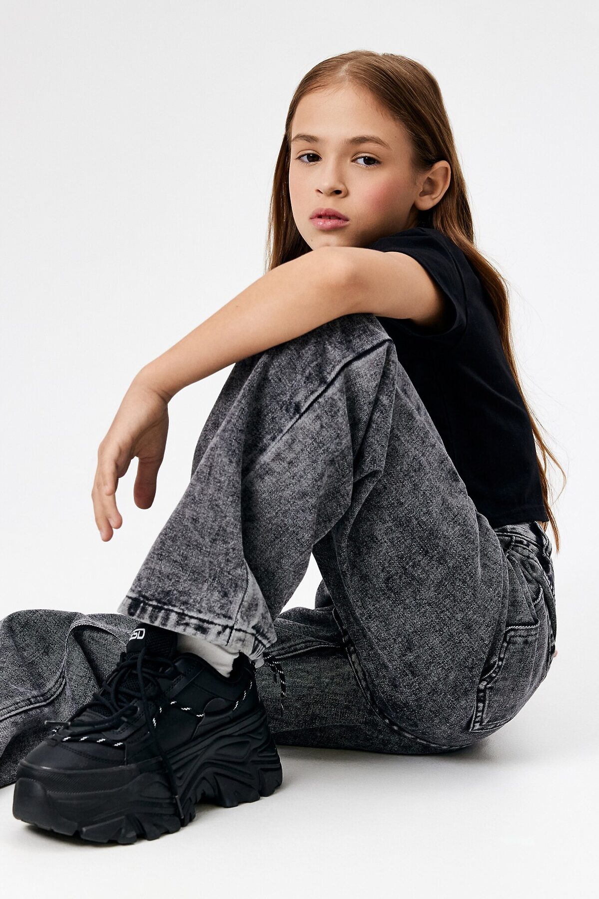 Детские джинсы wide leg с принтом из страз для девочки изготовлены из денима, что обеспечивает их долговечность и комфорт в течение дня. Пояс регулируется по объему с помощью внутренней эластичной ленты, добавляя удобство в ношении. Модель wide leg отличается широким кроем, что делает изделие трендовым. Два боковых кармана, два кармана на спинке и один внешний карман для мелочей позволяют легко распределить все необходимые предметы. Застежка на молнию и пуговицу не мешает при одевании. Спереди расположен принт из страз в виде сердечек, что придает изделию блеск и стильный вид, делая образ более оригинальным. Стилизуйте джинсы в сером цвете с лонгсливом (20210150120) и футболкой (20240510014) для создания ультрамодного повседневного образа, который подчеркнет утонченный вкус юной модницы. (20240440005)