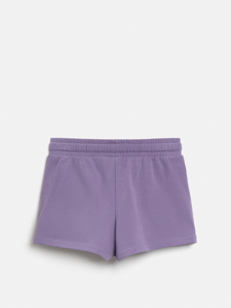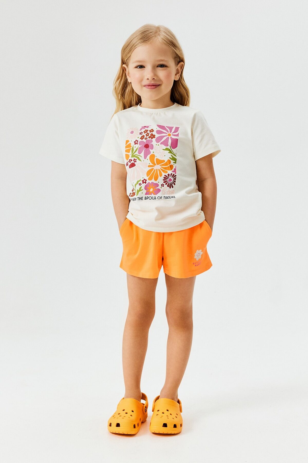 Детские шорты для девочки – это незаменимая вещь в гардеробе ребенка. Изделие выполнено из трикотажного полотна, которое обеспечивает комфорт в ношении. Модель прямого силуэта подходит для разных типов фигур. Пояс на резинке регулируется шнуром, позволяя подогнать изделие под параметры ребенка. Спереди расположен принт в виде бантика и надписи "ALWAYS SPECIAL" англ. - "Всегда особенный", что придает модели оригинальный вид. Длина выше колен делает шорты удобными для активного отдыха или катания на велосипеде. Модель представлена в трех вариантах: фиолетовом, розовом с принтом и оранжевом с принтом. Комбинируйте шорты с футболкой (20230510042), чтобы создать комфортный образ для повседневного ношения. Рост и размер модели на фото 110.