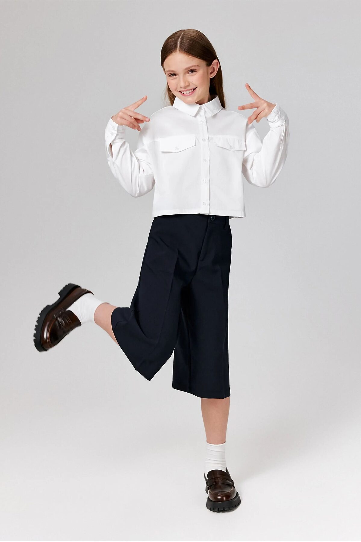 Детские темно-синие шорты-бермуды для девочки из качественной смесовой ткани. Удлиненные школьные шорты со стрелками — это стильная альтернатива брюкам для ношения в теплую погоду. Эластичная лента с пуговицей внутри пояса позволяет отрегулировать посадку под индивидуальные параметры ребенка. Шлевки для ремня вдоль линии пояса предоставляют возможность подчеркнуть образ любимым аксессуаром. Спереди расположена застежка на молнию и пуговицу, облегчающая одевание. Длина до колена и свободный силуэт позволяют легко двигаться и ощущать себя комфортно на протяжении всего дня. Заутюженные стрелки добавляют модели строгий штрих, подходящий под деловой дресс-код. Дополните шорты укороченной рубашкой (20240260226) и комплектным двубортным жакетом (20210420120), чтобы составить стильный школьный лук на каждый день. Рост модели на фото 143 см, размер на модели 140.