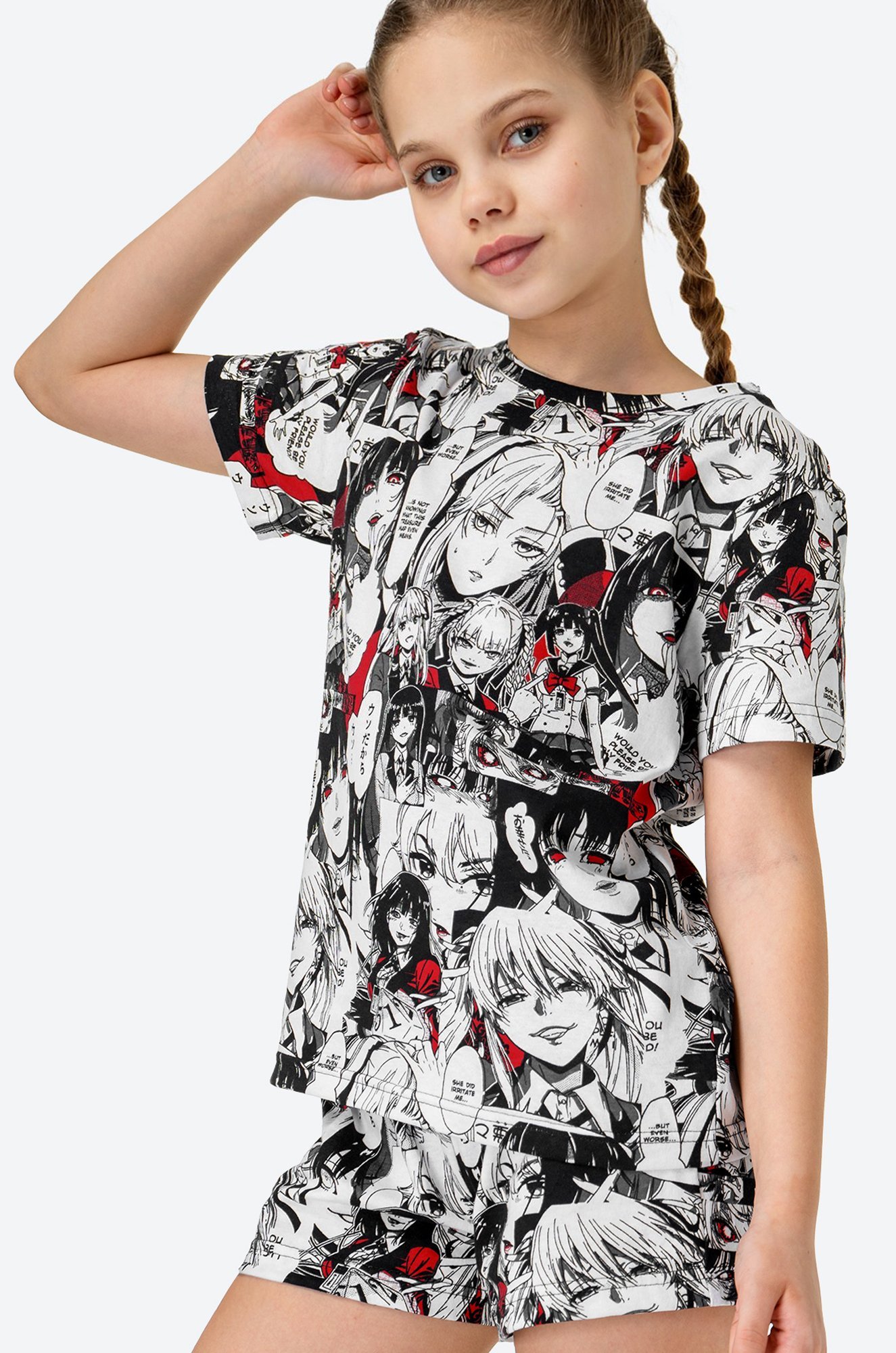 Аниме-кор в самом разгаре! Пижама с шортами для девочек и девочек-подростков выполнена из 100% хлопка, ткань кулирная гладь. Комплект состоит из футболки с коротким рукавом и шорт на резинке, украшен принтом в японском стиле.